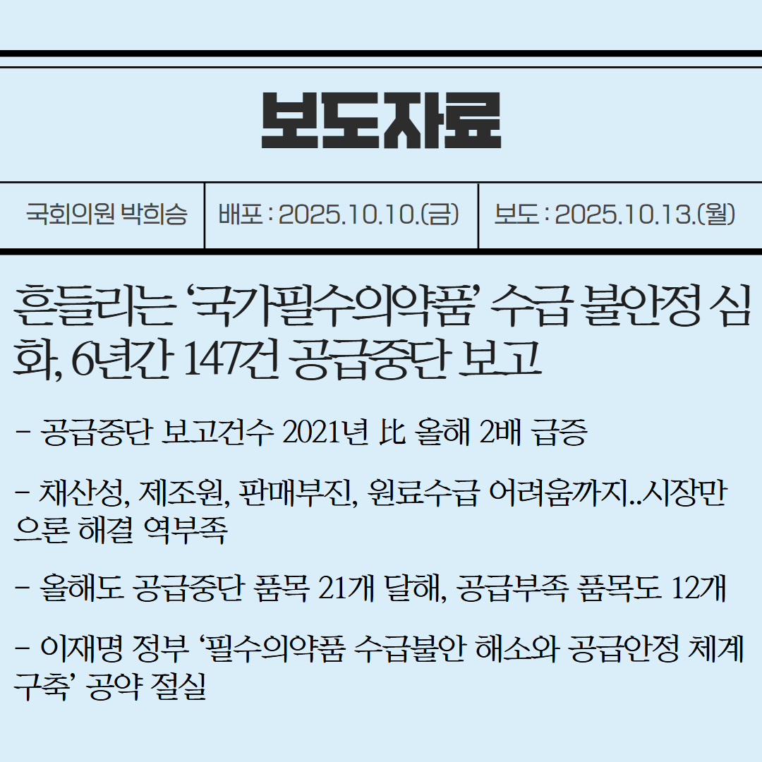 [국회의원 박희승 보도자료] 흔들리는 ‘국가필수의약품’ 수급 불안정 심화, 6년간 147건 공급중단 보고