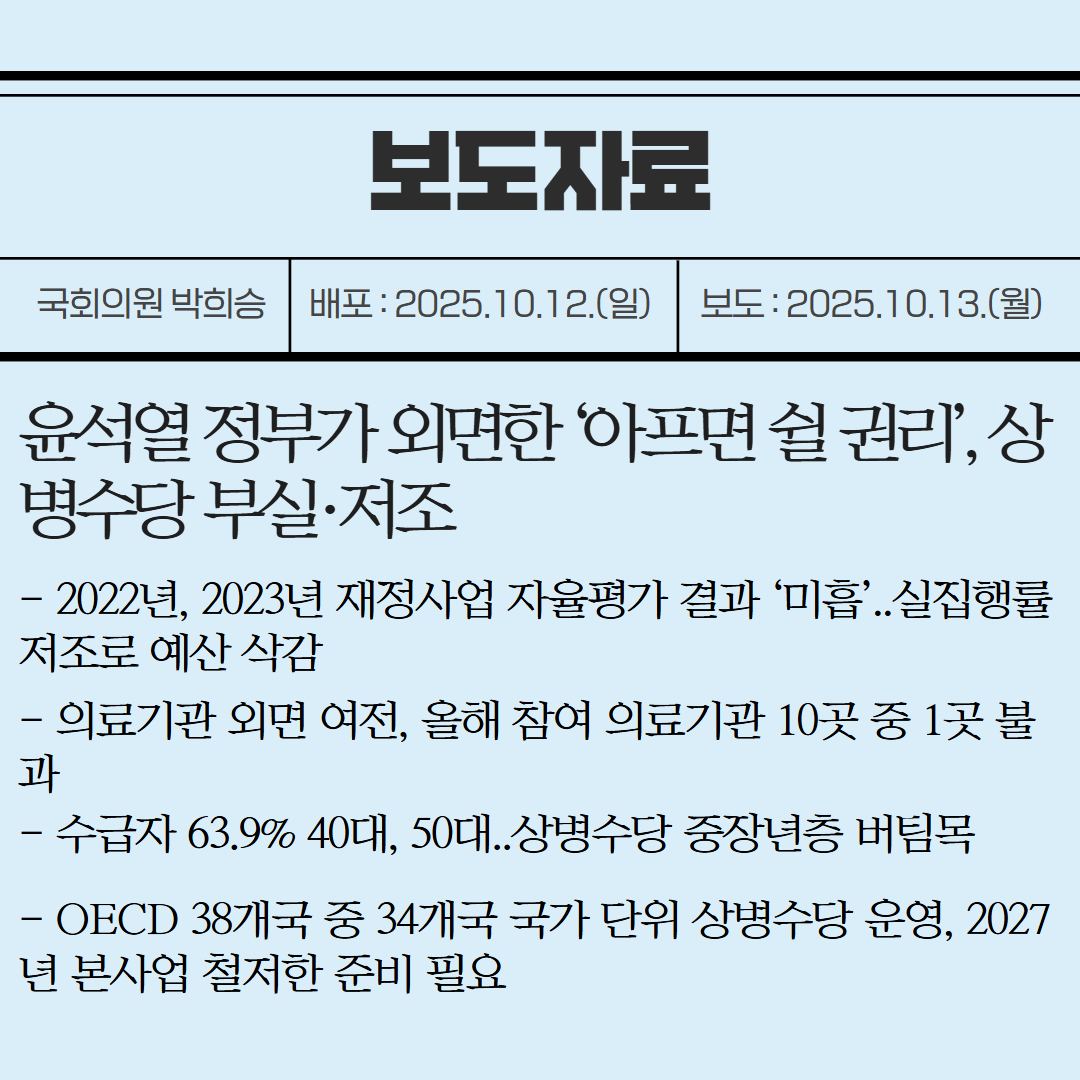 [국회의원 박희승 보도자료] 윤석열 정부가 외면한 ‘아프면 쉴 권리’, 상병수당 부실·저조