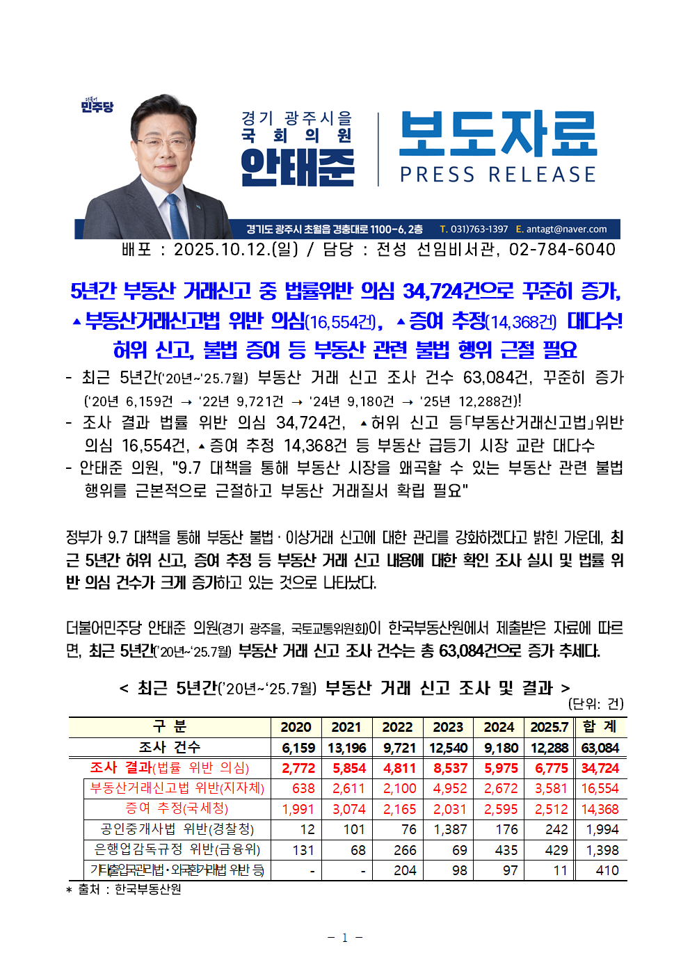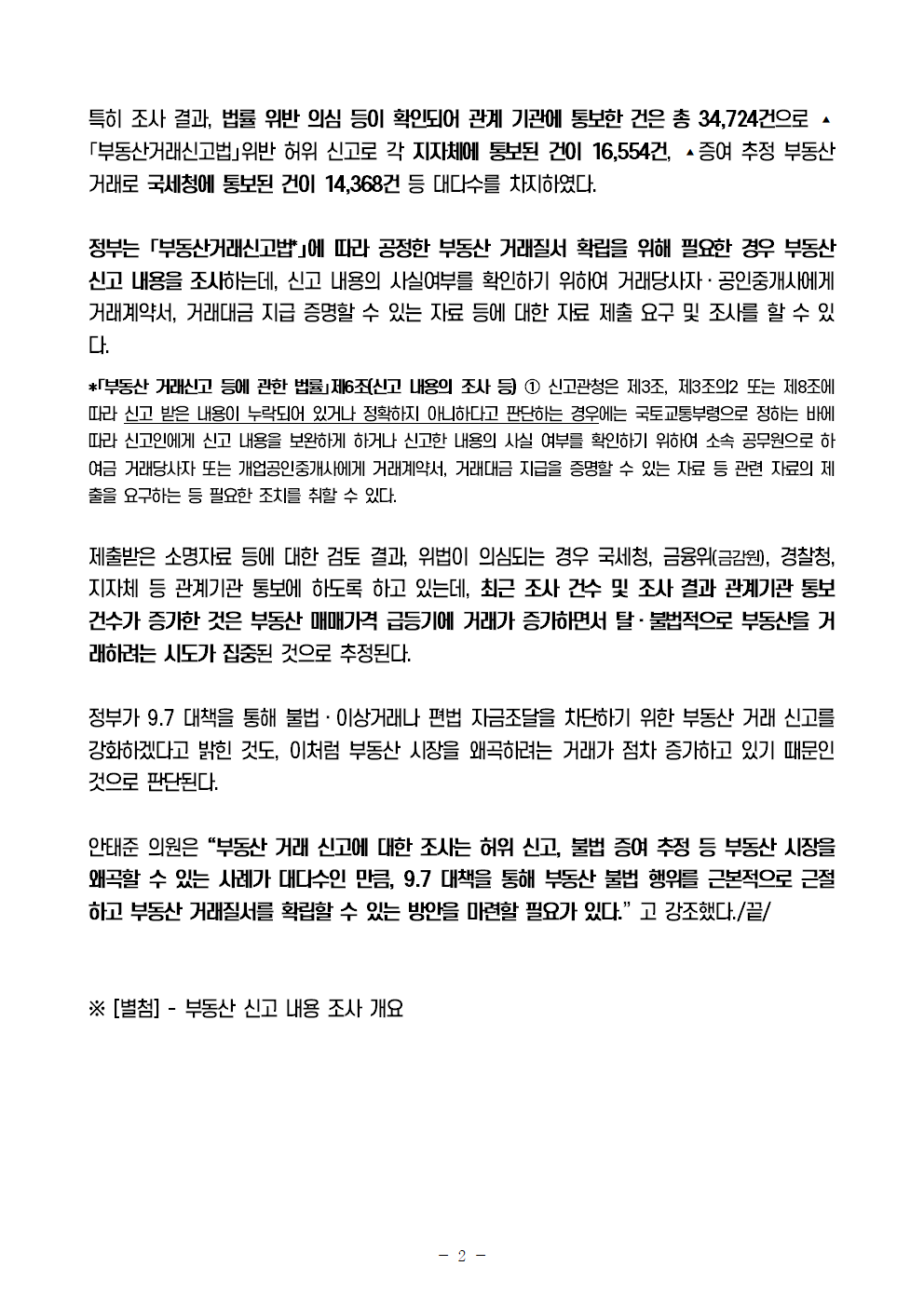 [안태준 의원 보도자료] 법률 위반 의심 부동산 거래신고 건수 5년간 34,724건!