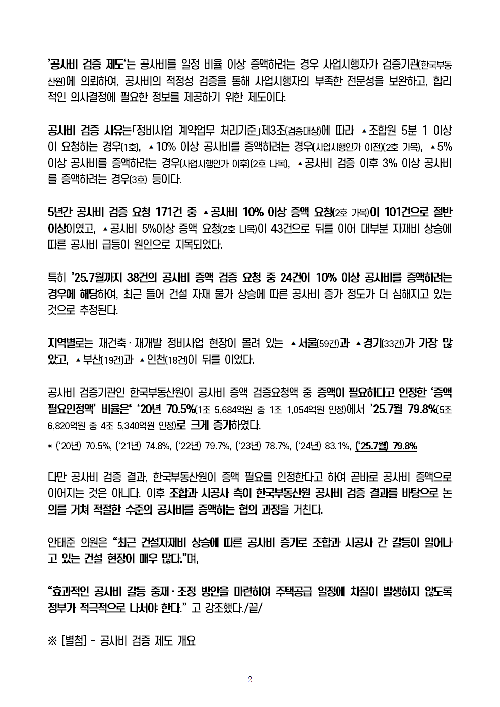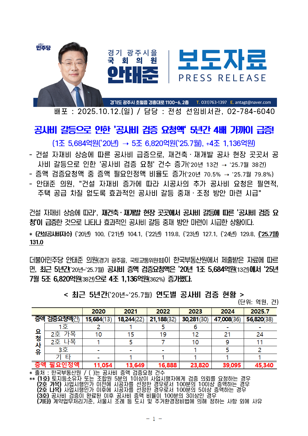 [안태준 의원 보도자료] 공사비 갈등으로 인한 ’공사비 증액 검증 요청액‘ 5년간 4배 가까이 급증!