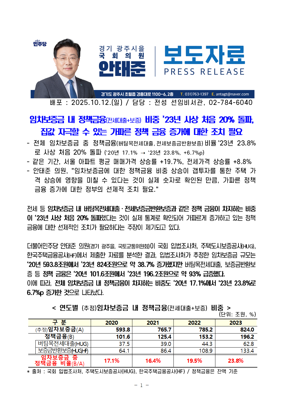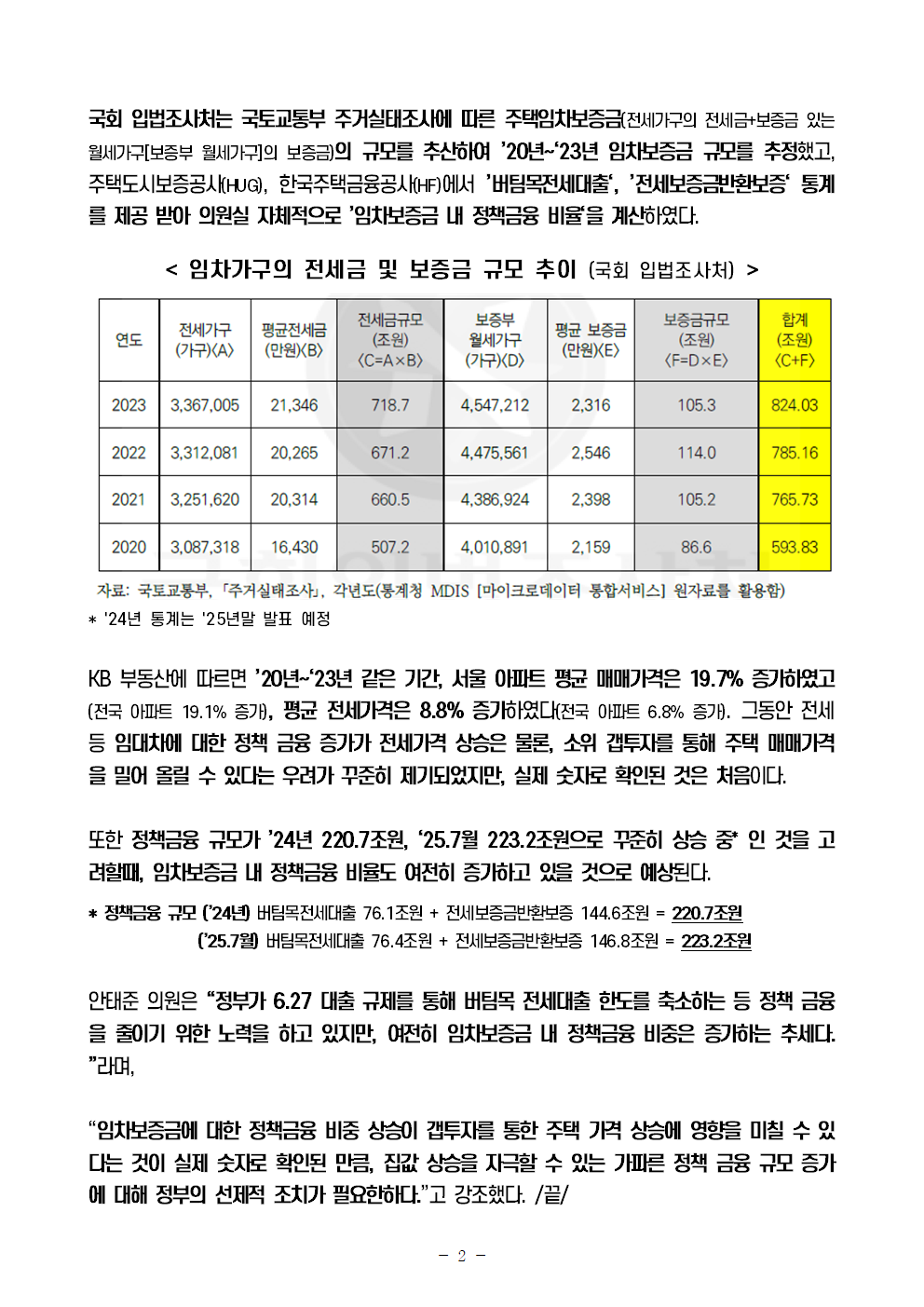 [안태준 의원 보도자료] 임차보증금 내 정책금융(전세대출+보증) 비중 ’23년 사상 처음 20% 돌파
