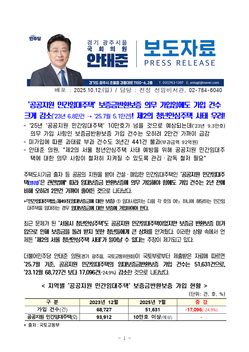 251012 (안태준 의원 보도자료) 7. ’민간임대주택‘ 보증금반환보증 의무 가입에도 가입 건수 1.3만건 이상 감소!.hwp