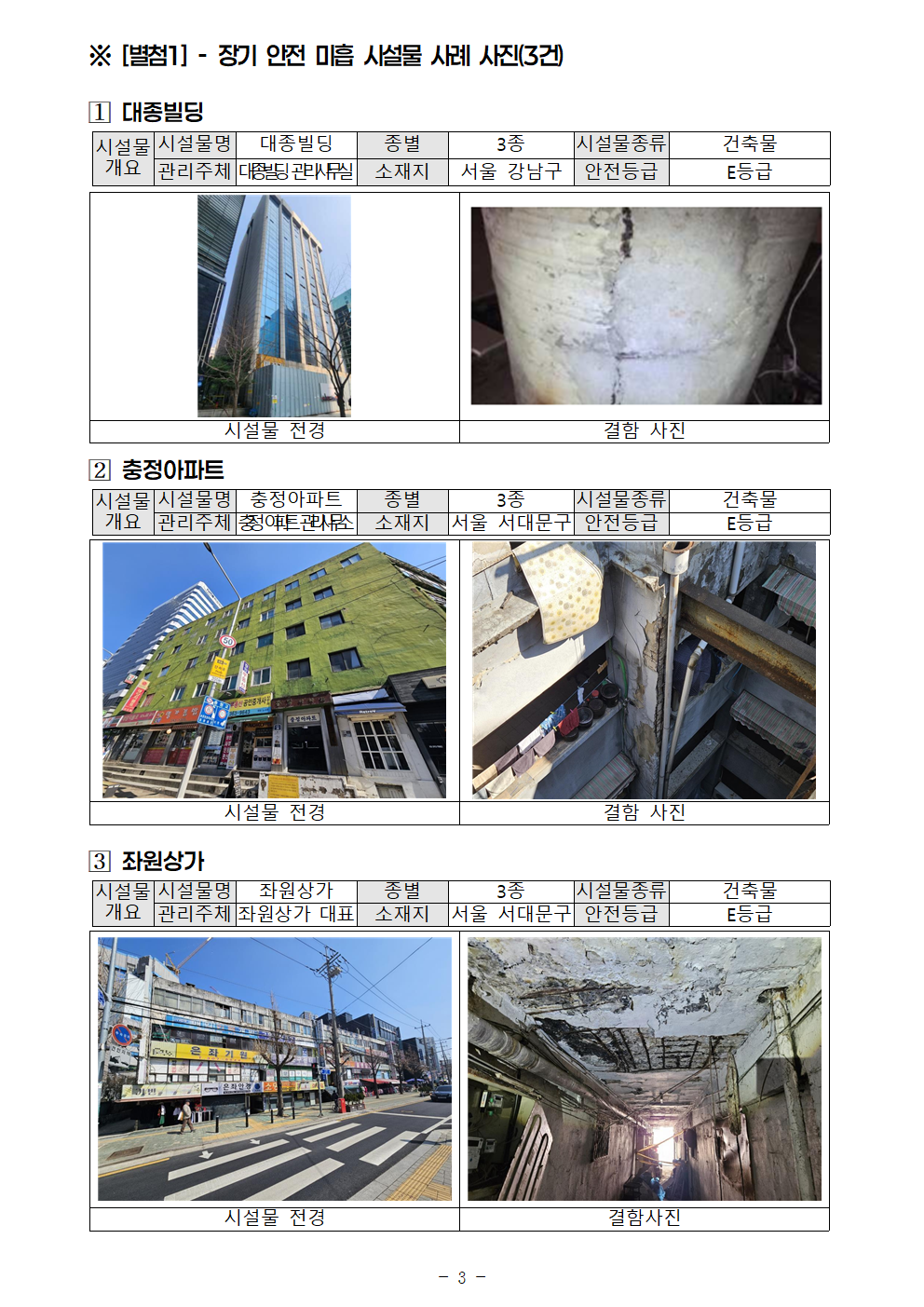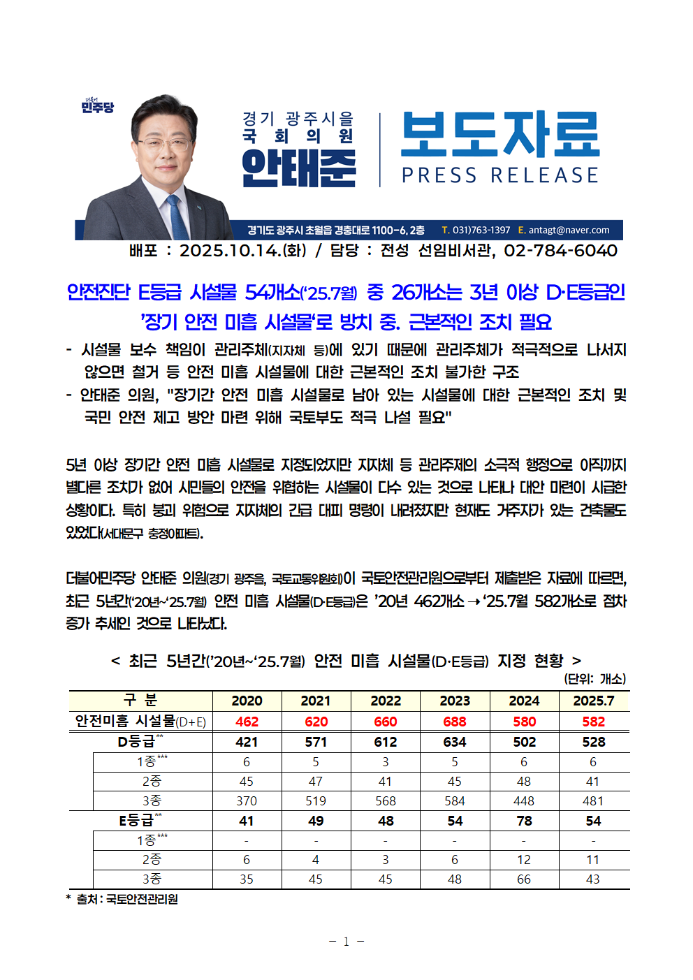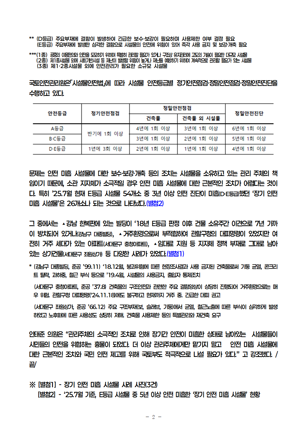 [안태준 의원 보도자료] 안전진단 E등급 시설물 54개소 중 26개소는 3년 이상 ’장기 안전 미흡 시설물‘로 방치 중!