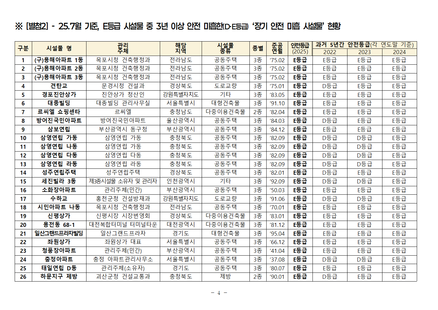 251014 (안태준 의원 보도자료) 4. 안전진단 E등급 시설물 54개소 중 26개소는 3년 이상 ’장기 안전 미흡 시설물‘로 방치 중!.hwp