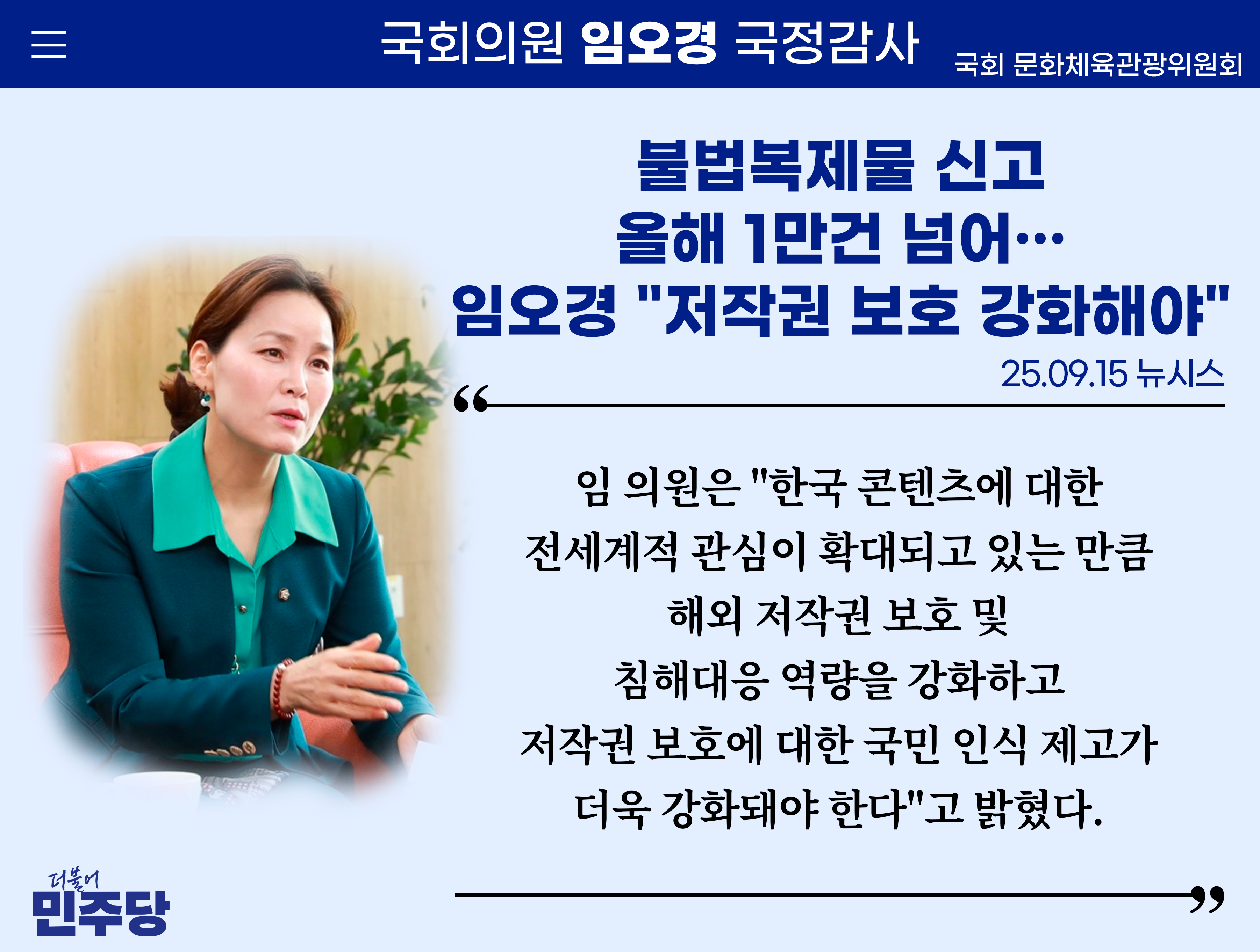 [임오경 카드뉴스]뉴시스 / 불법복제물 신고 올해 1만건 넘어…임오경 "저작권 보호 강화해야"