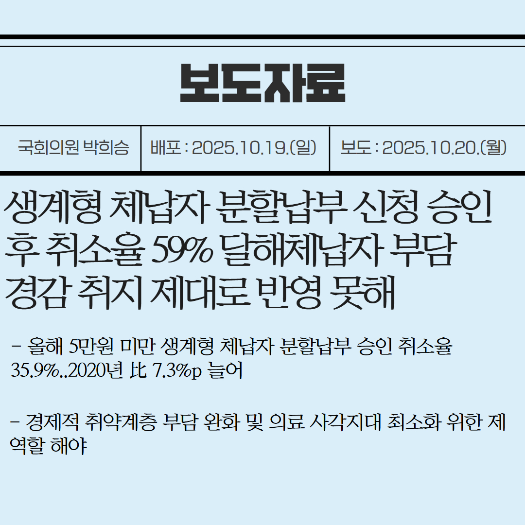 [국회의원 박희승 보도자료] 생계형 체납자 분할납부 신청 승인 후 취소율 59% 달해 체납자 부담 경감 취지 제대로 반영 못해