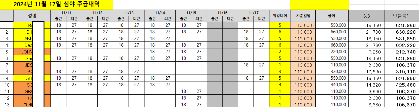 붙임2. A물류업체가 외국인 근로자들에게 3.3 사업소득세를 징수한 급여계산 내역