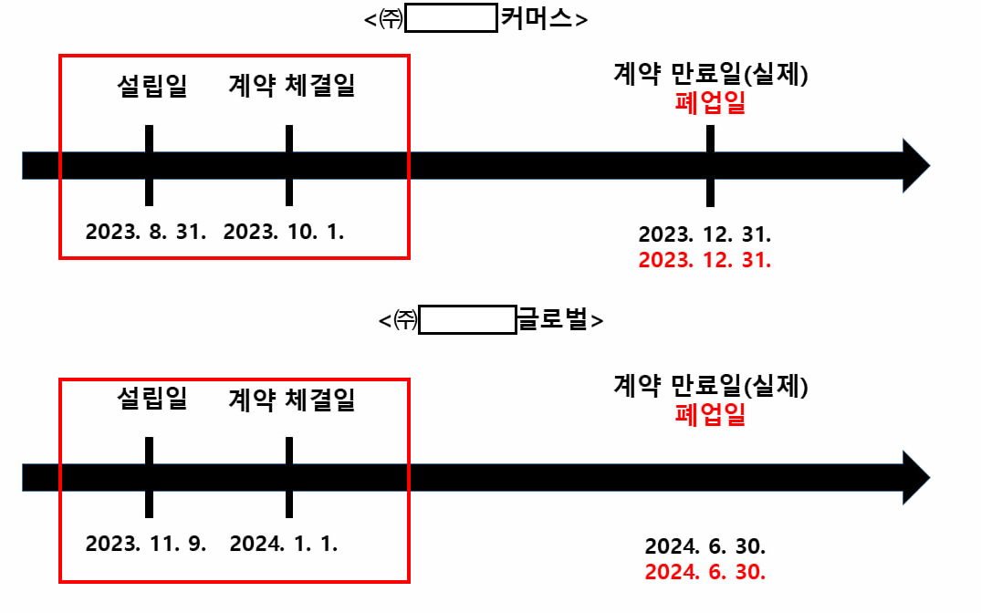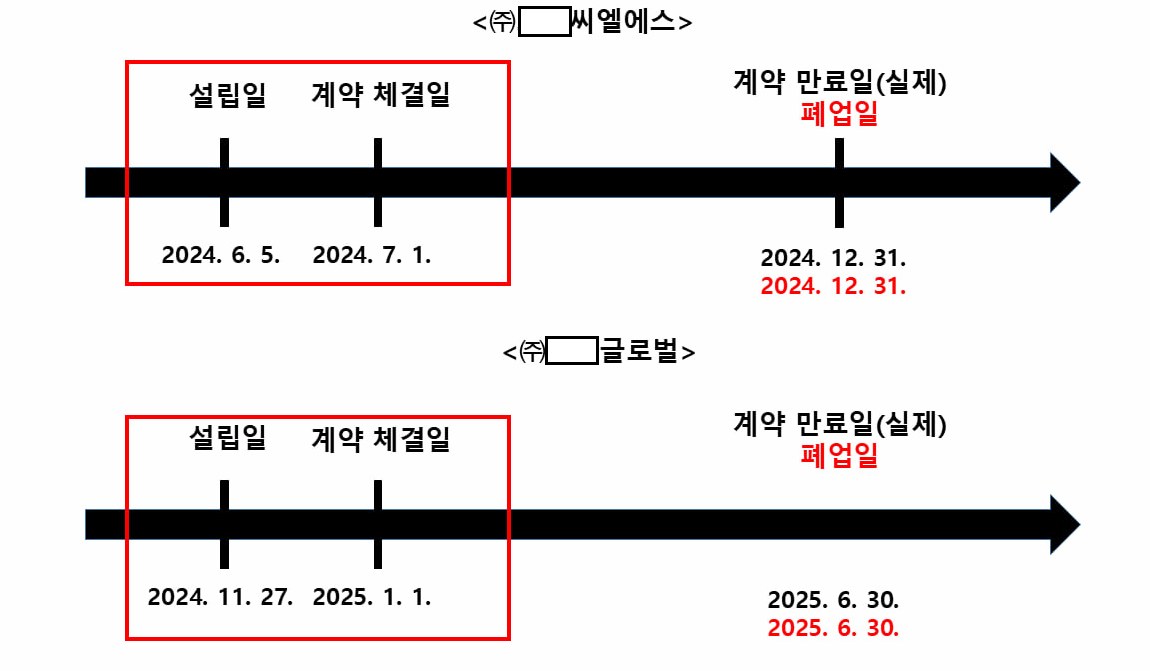 붙임3. (위장 사례) A물류업체와 계약을 체결한 페이퍼컴퍼니의 설립일과 폐업일