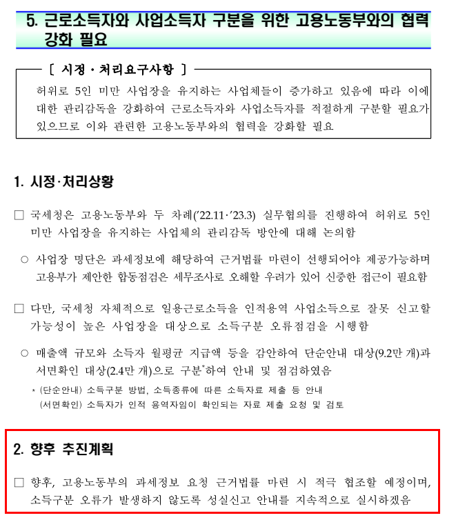 한편 10월 23일부터 근로기준법 개정으로 노동부가 국세청과 근로복지공단에 사업소득 관련 과세 정보, 사업장별 고용·산재보험 가입 내역을 요구하는 것이 가능해지면서, 가짜 3.3과 5인 미만 위장 사업장을 보다 더 선제적으로 감독하는 것이 가능해졌다.