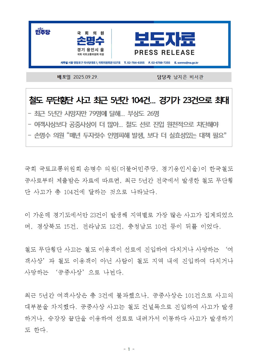 [국회의원 손명수 보도자료] 철도 무단횡단 사고 최근 5년간 104건... 경기가 23건으로 최대