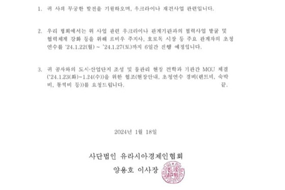 강득구 더불어민주당 의원실에 따르면, 유라시아경제인협회는 지난해 1월 한국수자원공사에 '우크라이나 재건 사업' 관련 업무를 위해 한국을 찾는 우크라이나 지원단의 경비를 청구하는 공문을 발송했습니다.