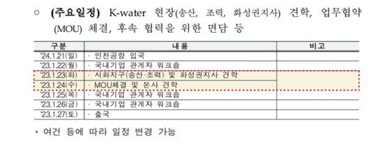 그런데 지원단의 주요 일정을 살펴보면, 방한 6일 가운데 한국수자원공사와 관련된 일정은 시화지구 및 화성권지사 견학, MOU 체결 및 본사 견학 등 이틀뿐으로, 나머지는 국내 다른 기업과의 워크숍 일정이었습니다.
