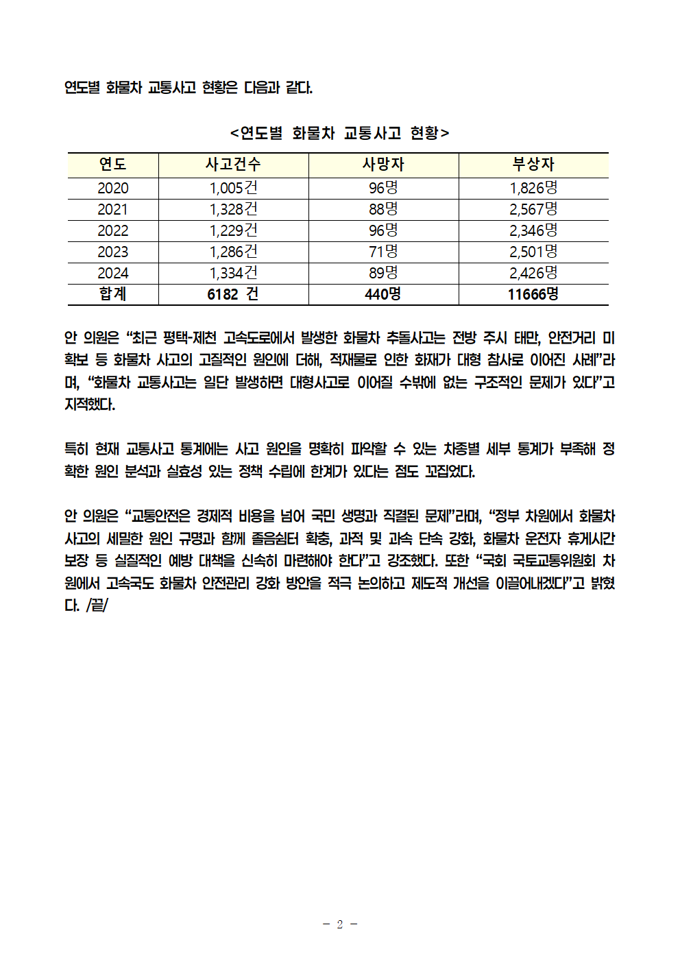 [안태준 의원 보도자료] 최근 5년간 고속도로 화물차 사고 매년 1,000건 이상 발생… 대책 시급