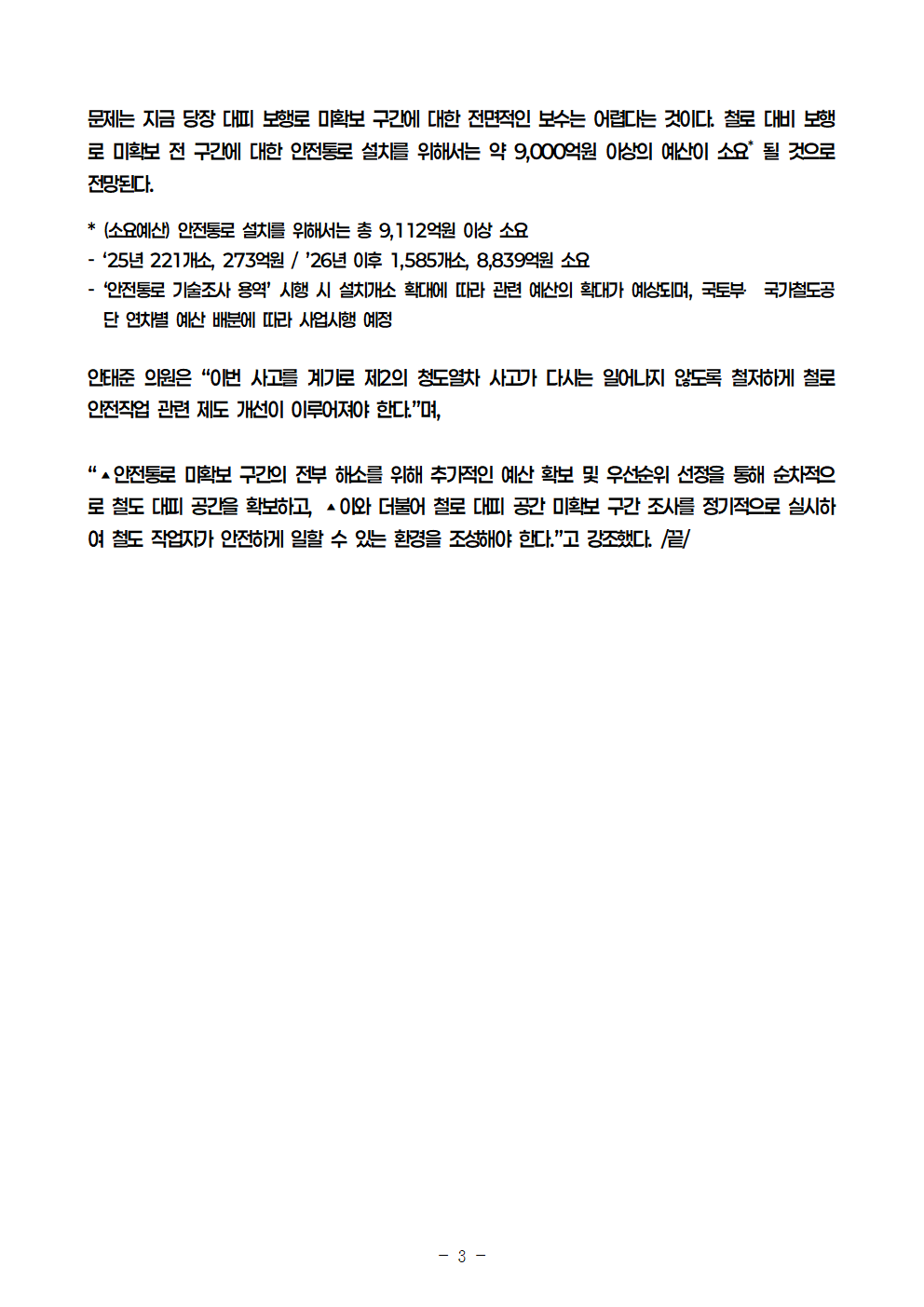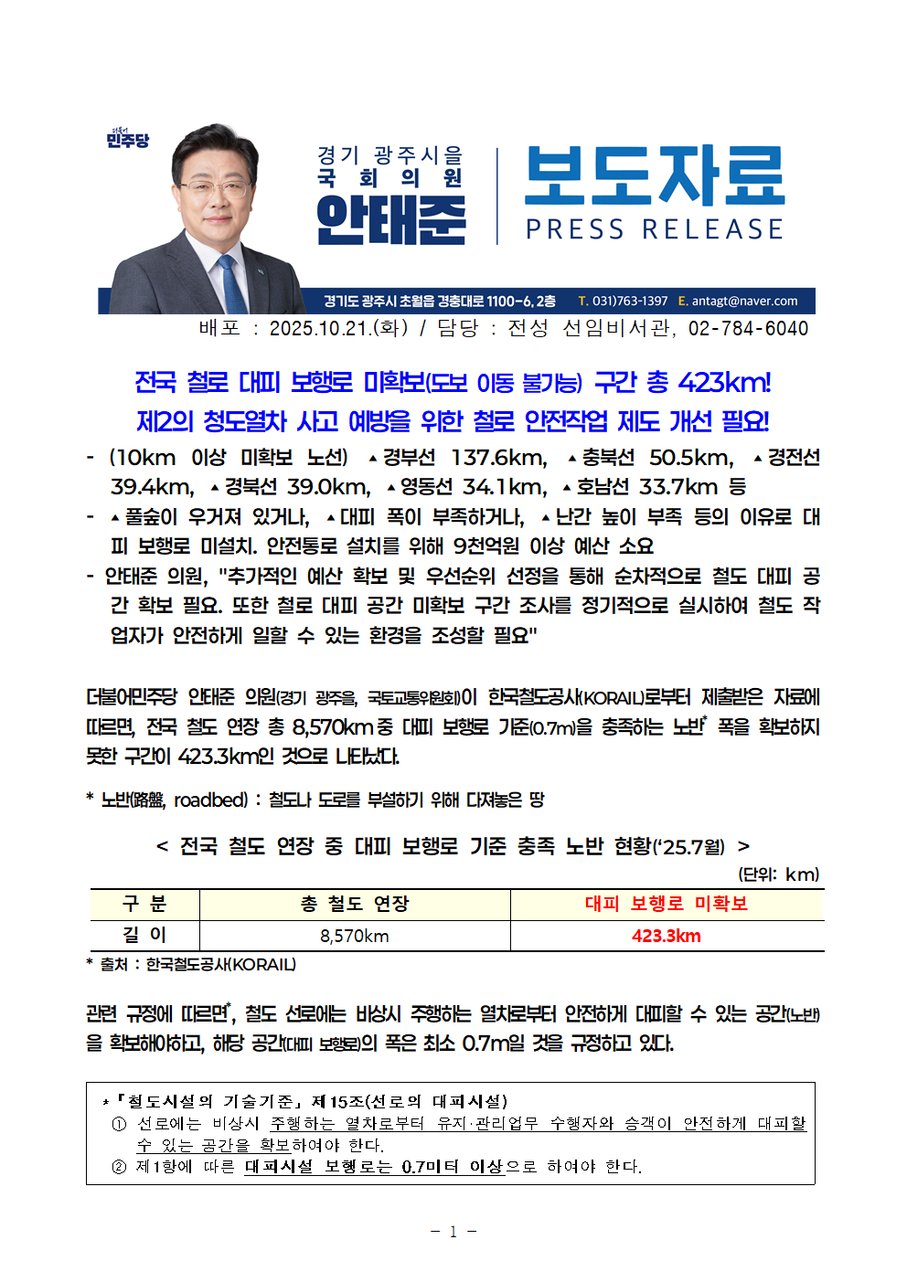 251021_안태준_의원_보도자료_전국_철로_대피_보행로_미확보도보_이동_불가능_구간_총_423km!.hwp