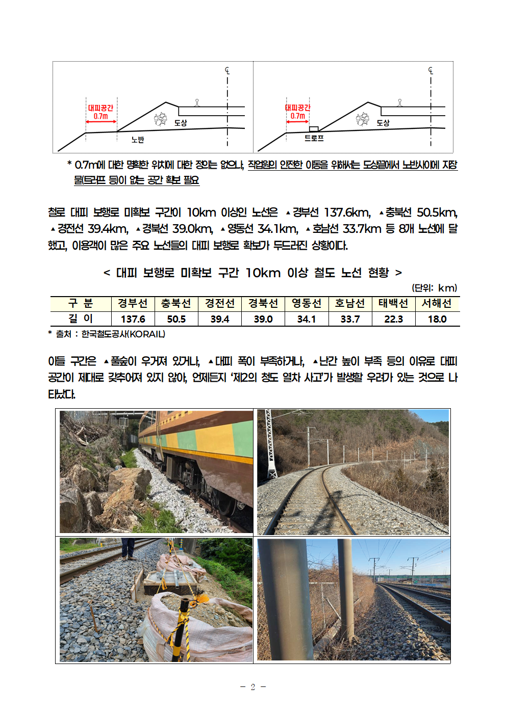 [안태준 의원 보도자료] 전국 철로 대피 보행로 미확보도보 이동 불가능 구간 총 423km!