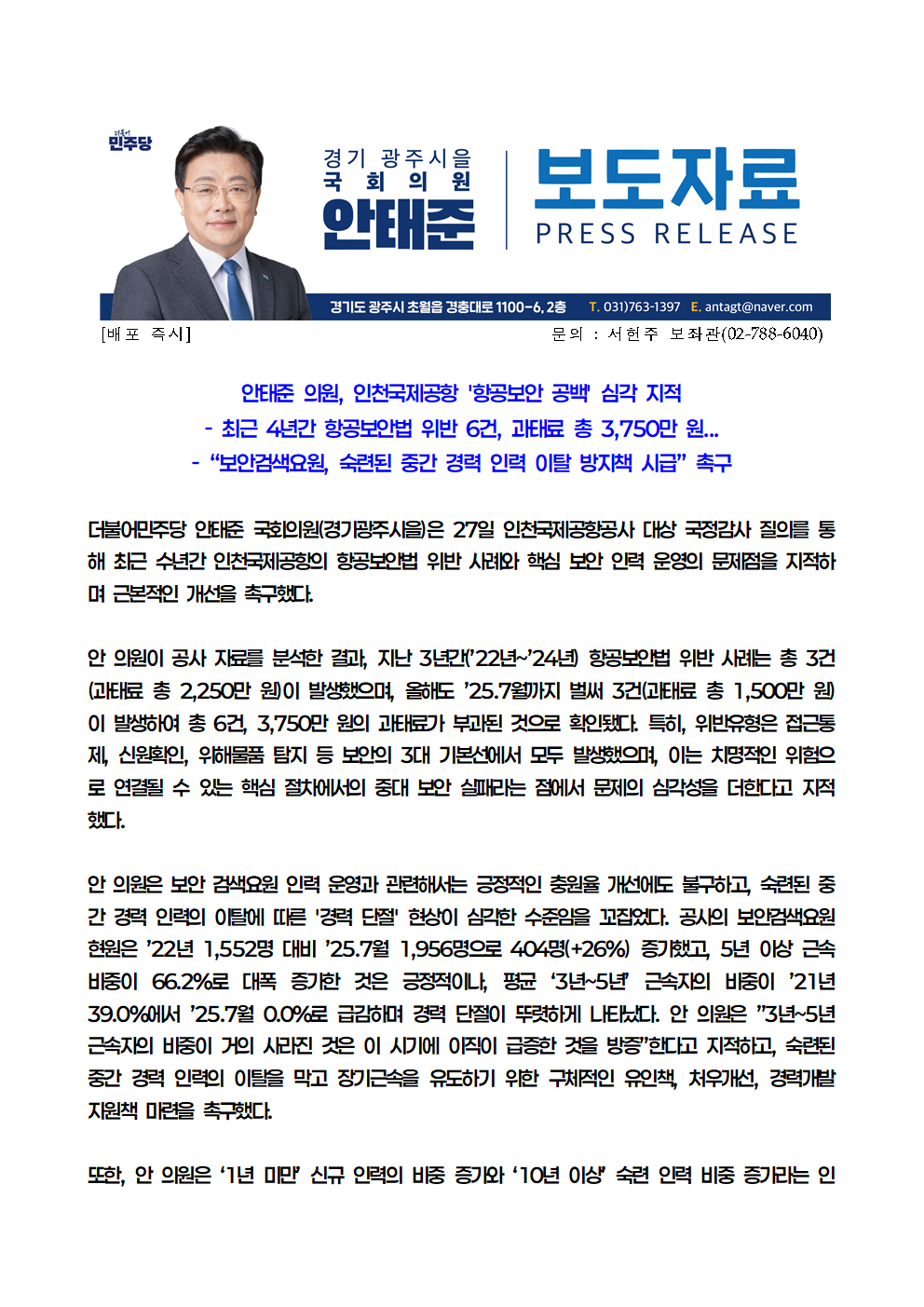 251027_보도자료_안태준_의원실_안태준 의원 인천국제공항 항공보안 공백 심각 지적.hwp