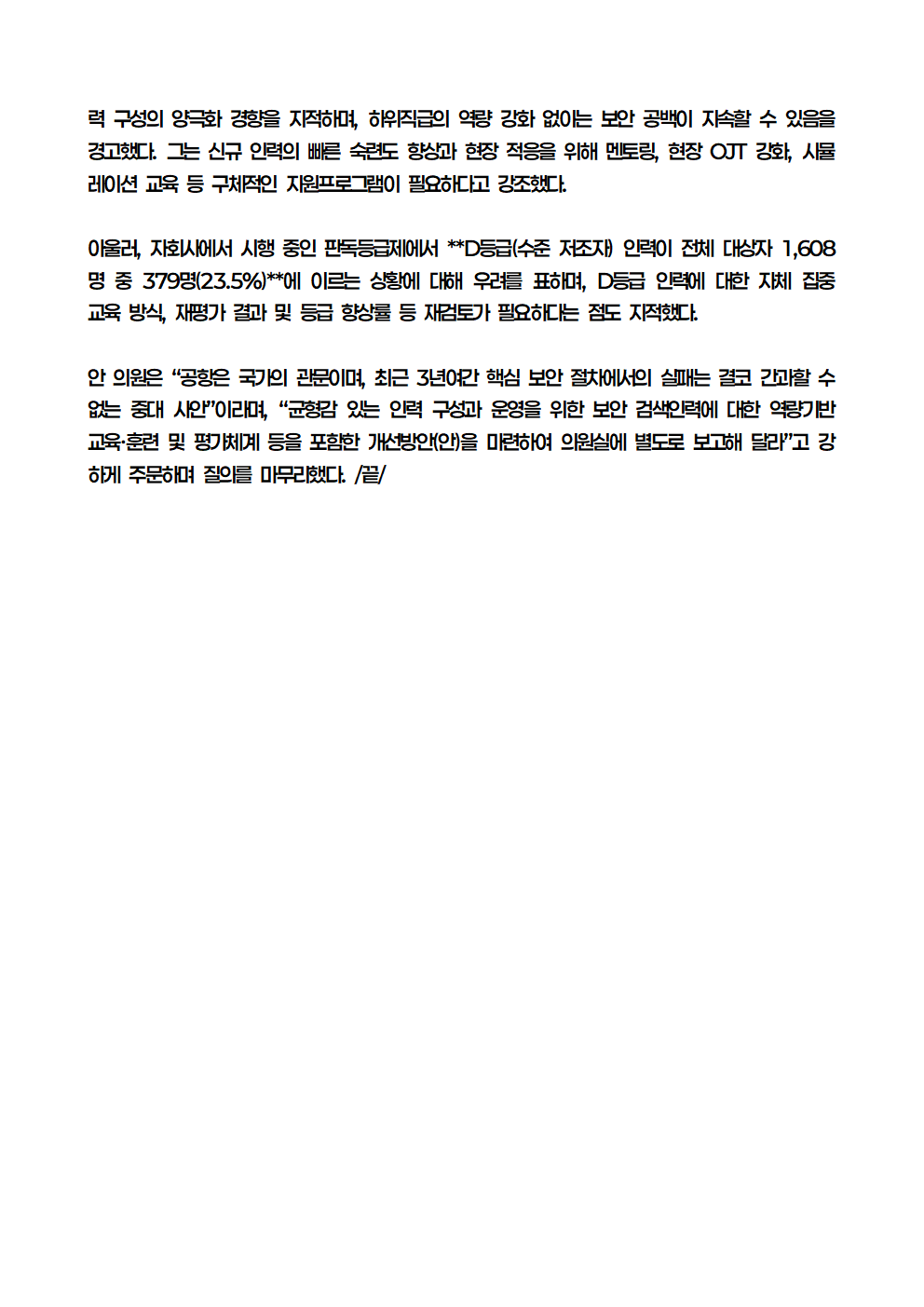 [안태준 의원 보도자료] 안태준 의원, 인천국제공항 '항공보안 공백' 심각 지적