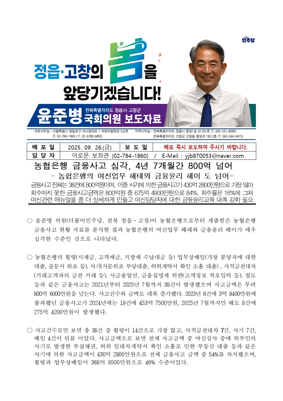 [윤준병 의원 국정감사 보도자료] 윤준병 의원, 농협은행 금융사고 심각, 4년 7개월간 800억 넘어