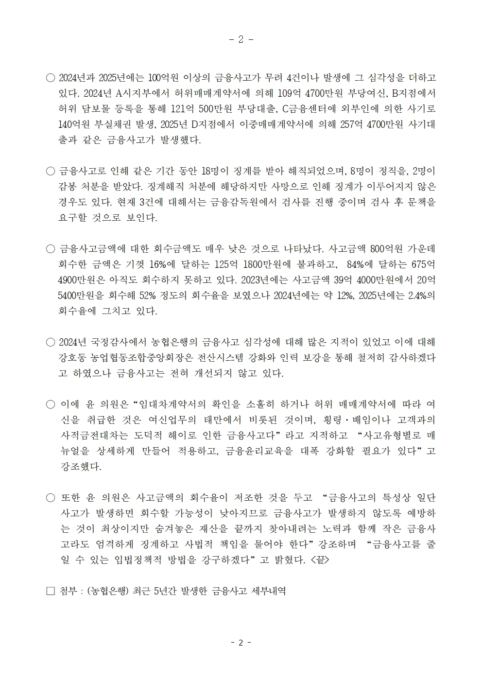250926 [윤준병 의원 국정감사 보도자료] 윤준병 의원 농협은행 금융사고 심각 4년 7개월간 800억 넘어.hwp