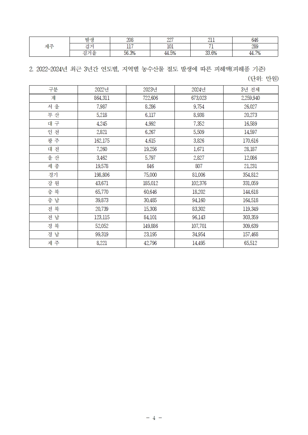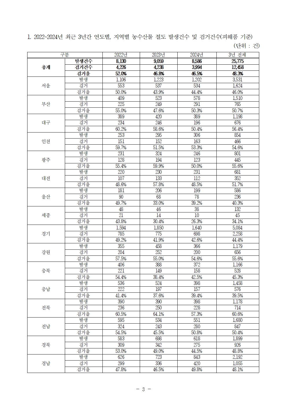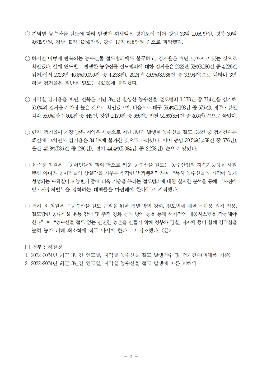 251010 [윤준병 의원 국정감사 보도자료] 3년간 농수산물 절도 2.5만건·피해액 226억에도 검거율 절반 안돼.hwp