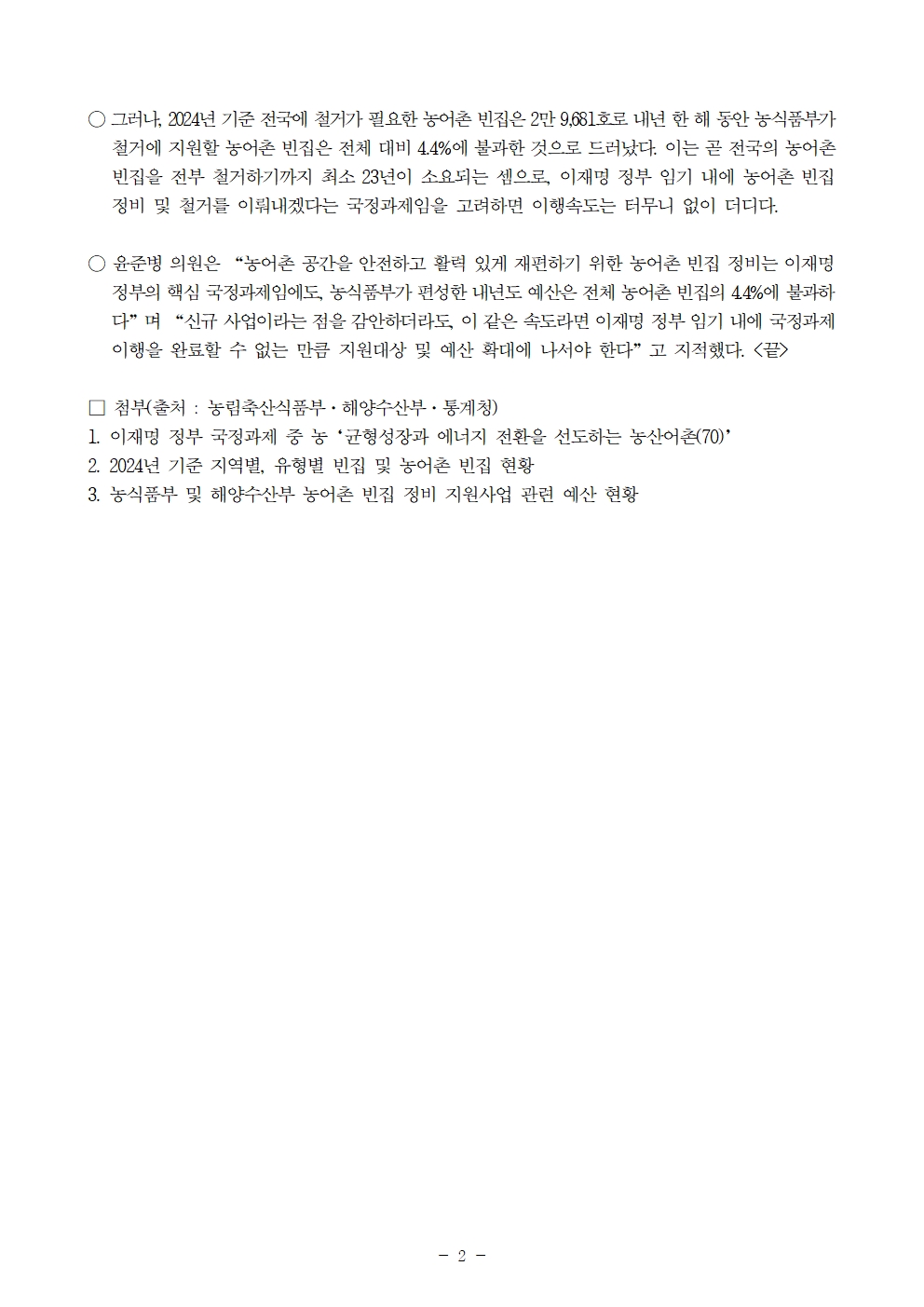 251014 [윤준병 의원 국정감사 보도자료] 철거 필요 농어촌 빈집 3만호인데 1292호만 철거 최소 23년 소요.hwp