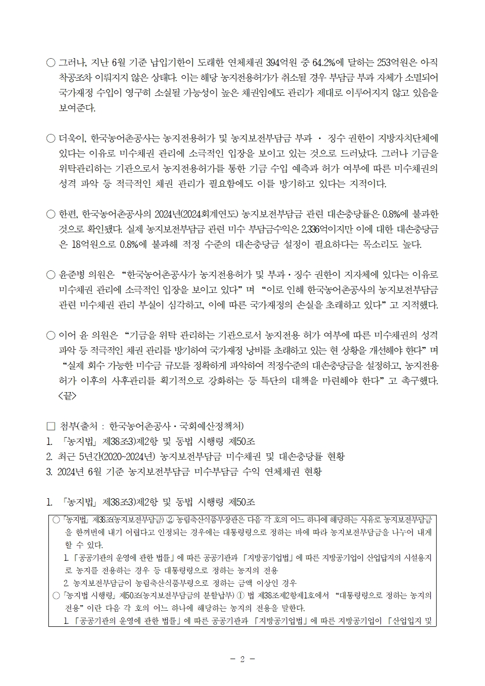 [윤준병 의원 국정감사 보도자료] 농어촌공사, 농지보전부담금 미수채권 5년 새 800억·52% 급증