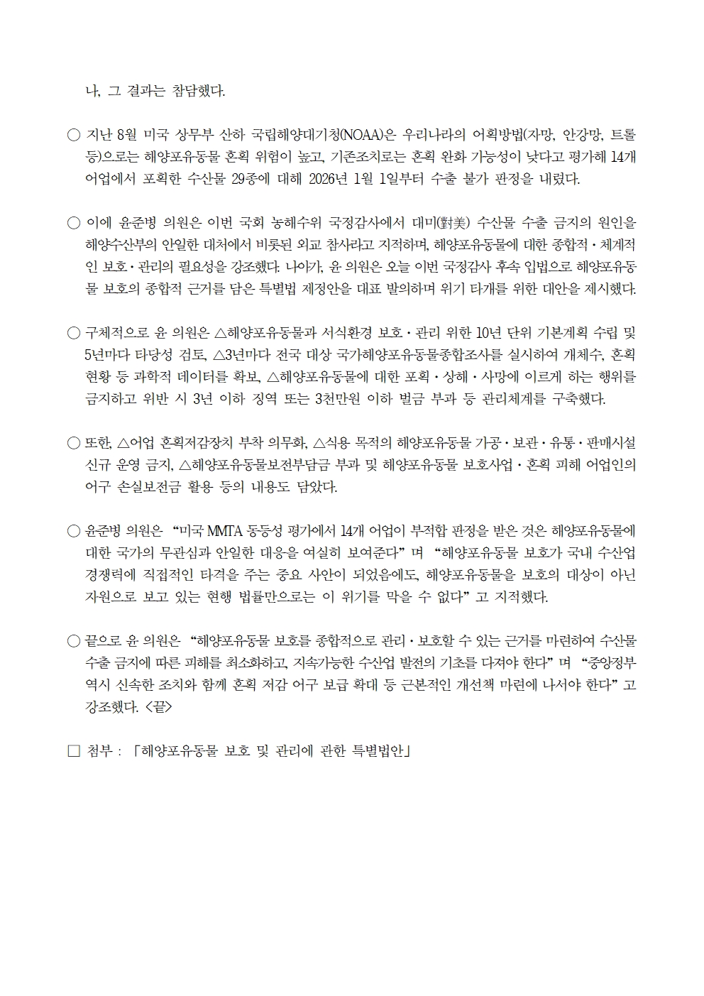 251029 [윤준병 의원 국정감사 보도자료] 내년 대미 수산물 수출 금지 대응 위한 ‘해양포유동물 보호 특별법’ 발의!.hwp