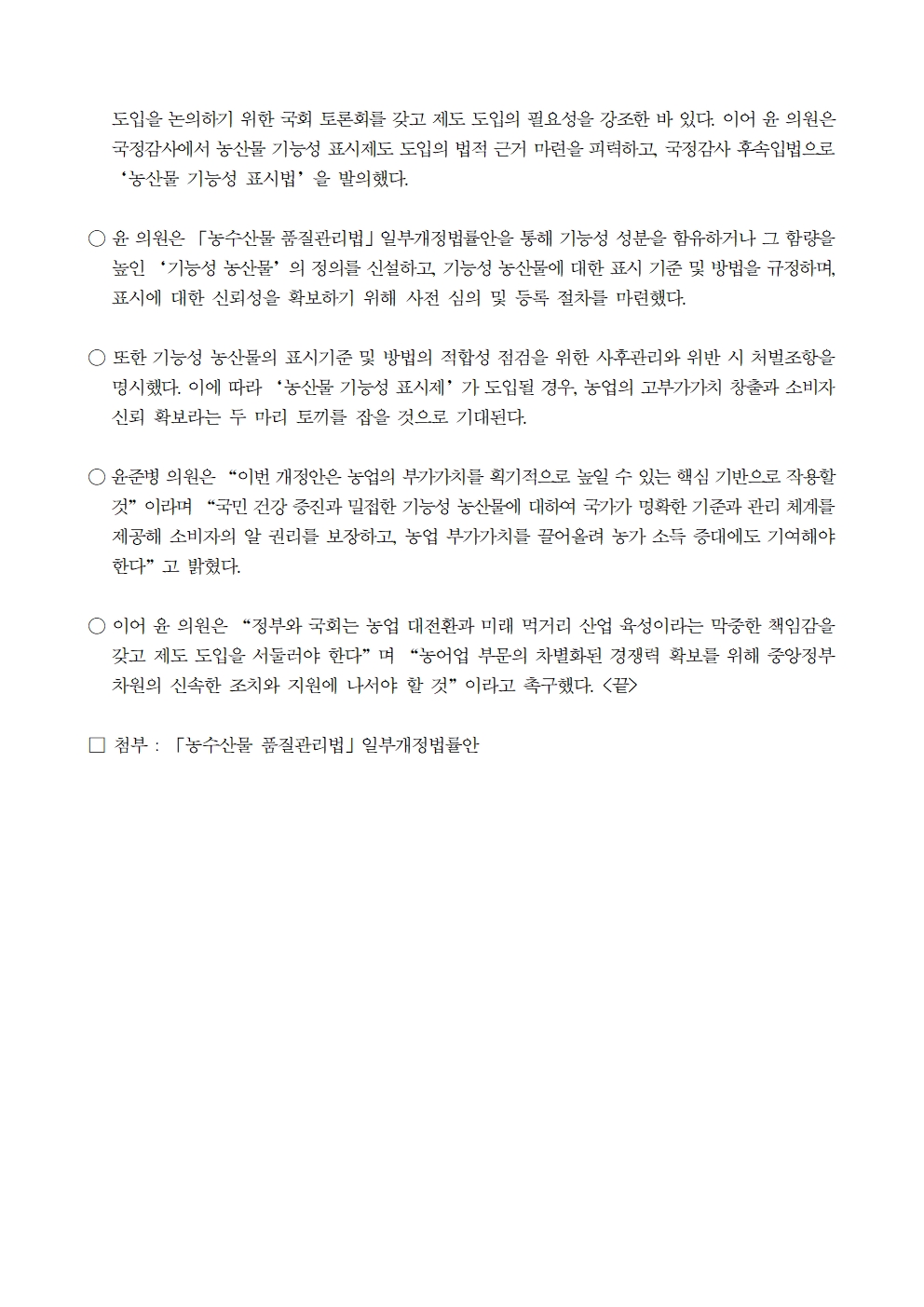 [윤준병 의원 국정감사 보도자료] 윤준병 의원, ‘농산물 기능성 표시법’ 발의로 국정감사 대안 제시!