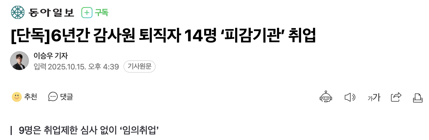 감사원 퇴직공무원 76명 중 14명(18.4%)은 피감 대상 기관인 한국가스공사, 한국부동산원, 국가철도공단 등 공공기관에 취업한 것으로 나타났다. 정부는 퇴직 공무원이 퇴직 전 근무했던 기관에 영향력을 행사하는 것을 방지하고 공무집행의 공정성과 공직윤리 확립을 위해 퇴직 전 5년 간 근무했던 부서와 취업예정기관 관 업무 관련성이 있는 경우 취업을 제한하는 ‘취업제한 심사 제도’를 운영하고 있지만, 불승인 없이 100% 취업 승인을 받았다.