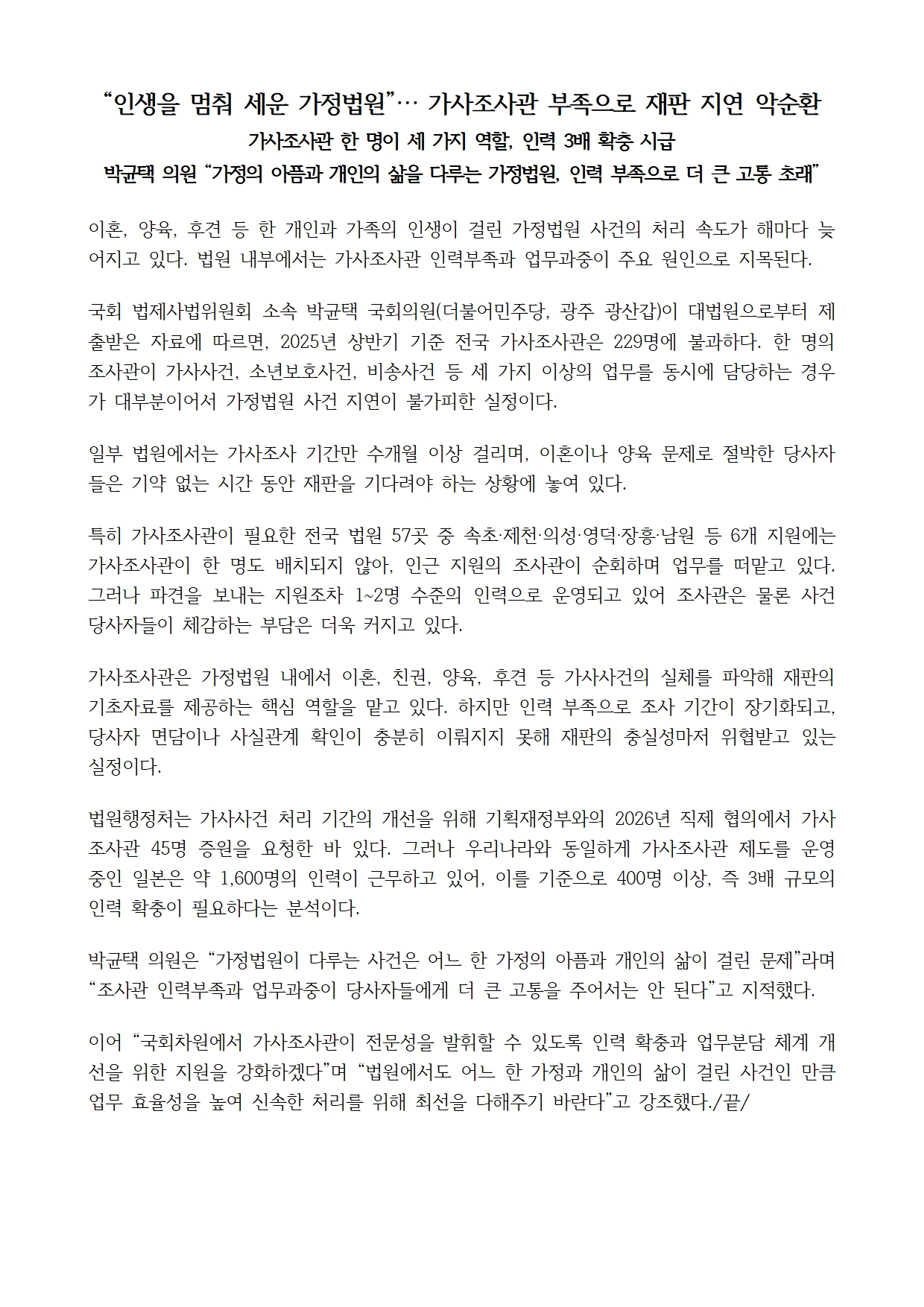 [박균택 의원 국정감사 보도자료] “인생을 멈춰 세운 가정법원”… 가사조사관 부족으로 재판 지연 악순환
