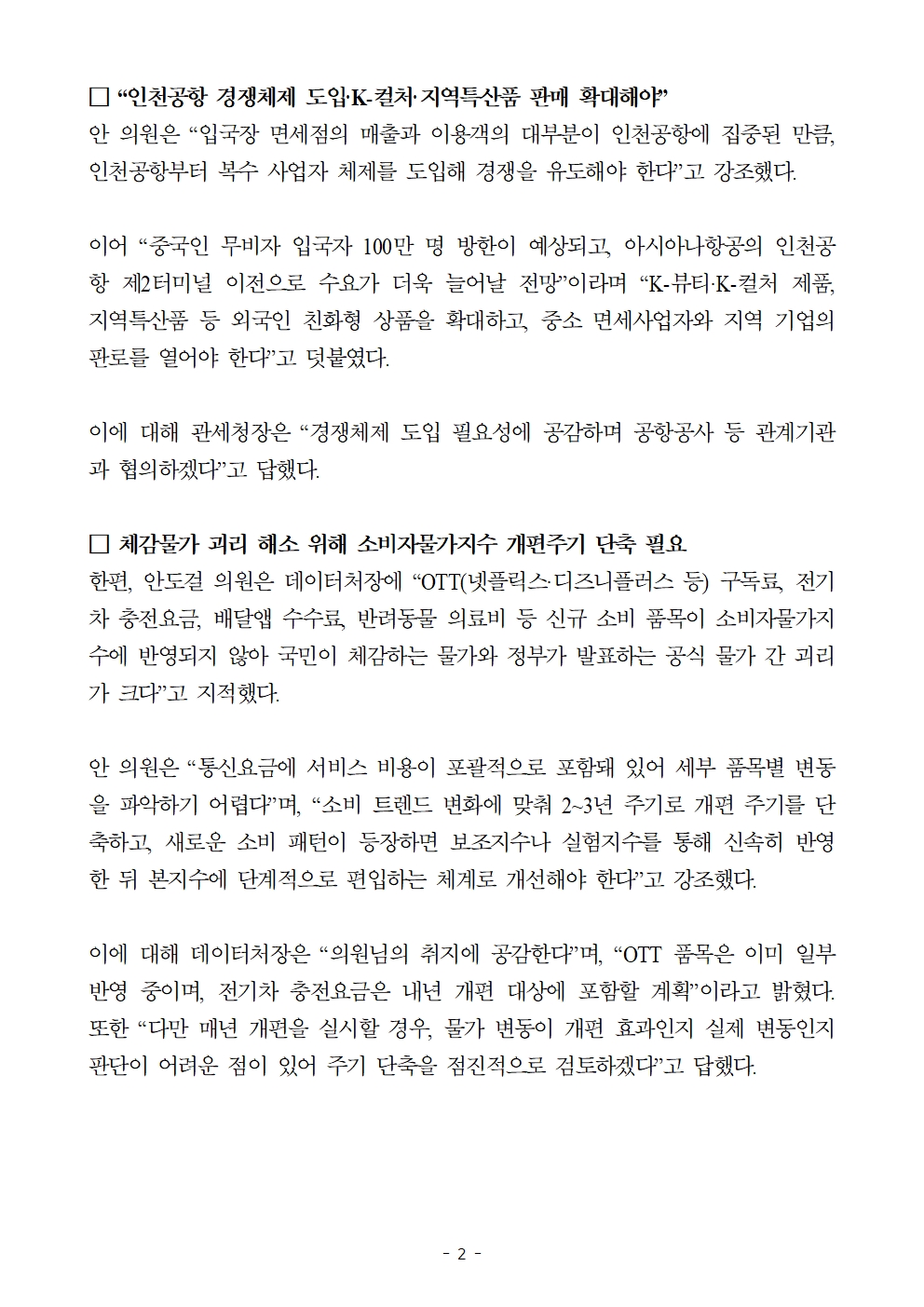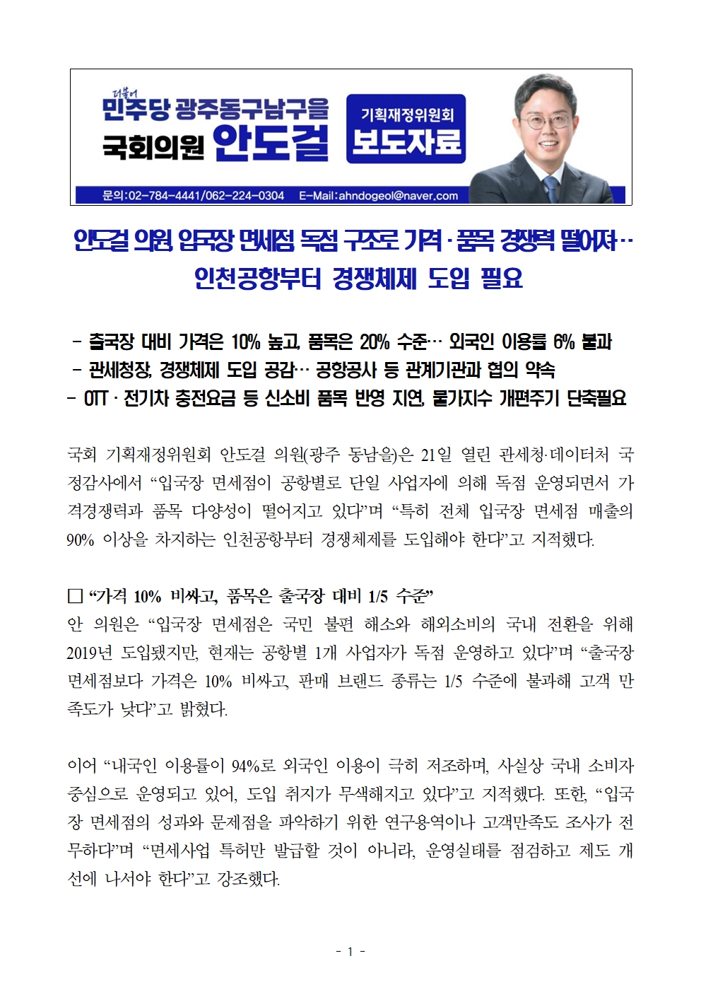 [국회의원 안도걸 보도자료] 입국장 면세점, 독점 구조로 가격·품목 경쟁력 떨어져…인천공항부터 경쟁체제 도입 필요