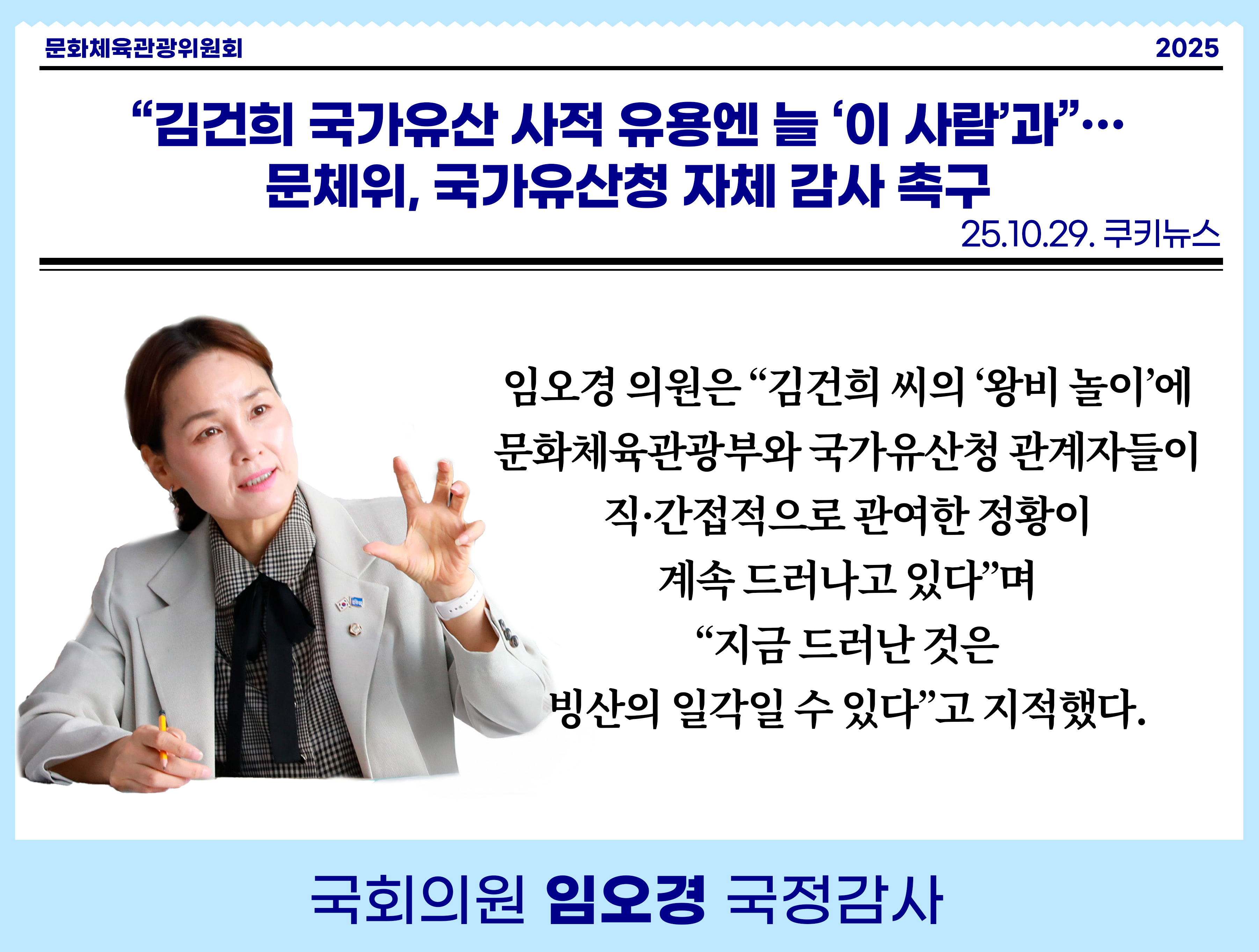 [임오경 카드뉴스]쿠키뉴스 / “김건희 국가유산 사적 유용엔 늘 ‘이 사람’과”…문체위, 국가유산청 자체 감사 촉구