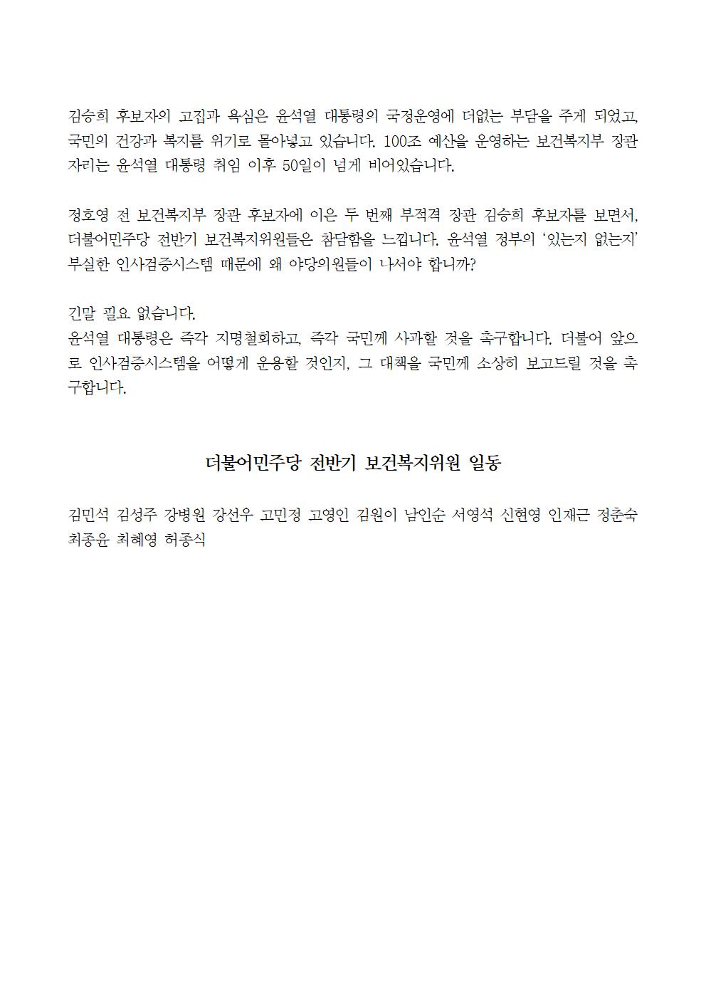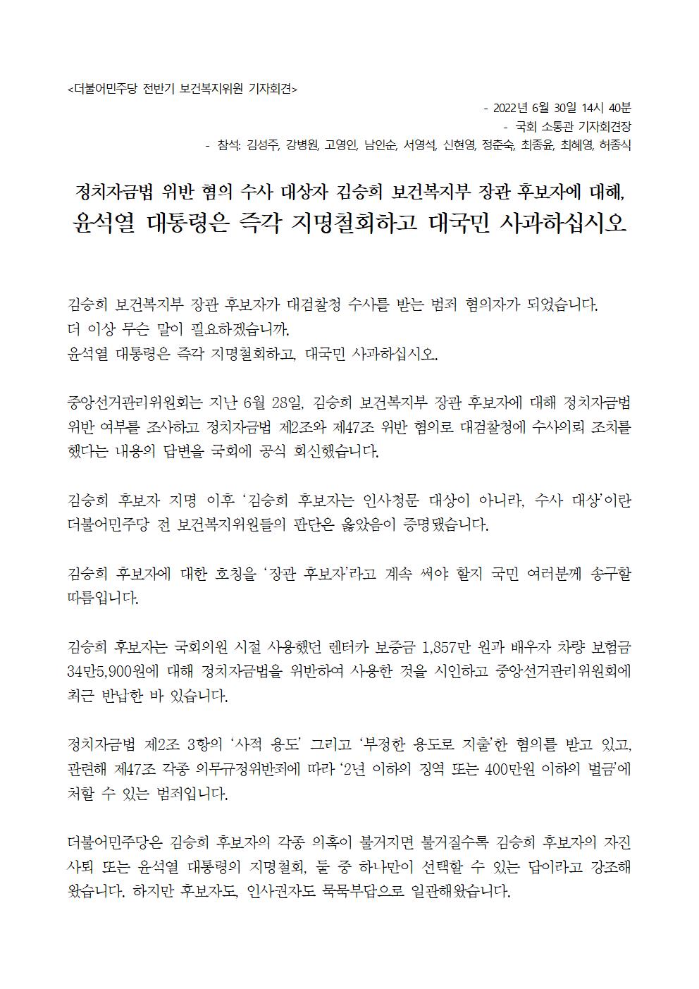 [기자회견문] 정치자금법 위반 협의 수사 대상자 김승희 보건복지부 장관 후보자에 대해 윤석열 대통령은 즉각 지명철회하고 대국민 사과하십시오