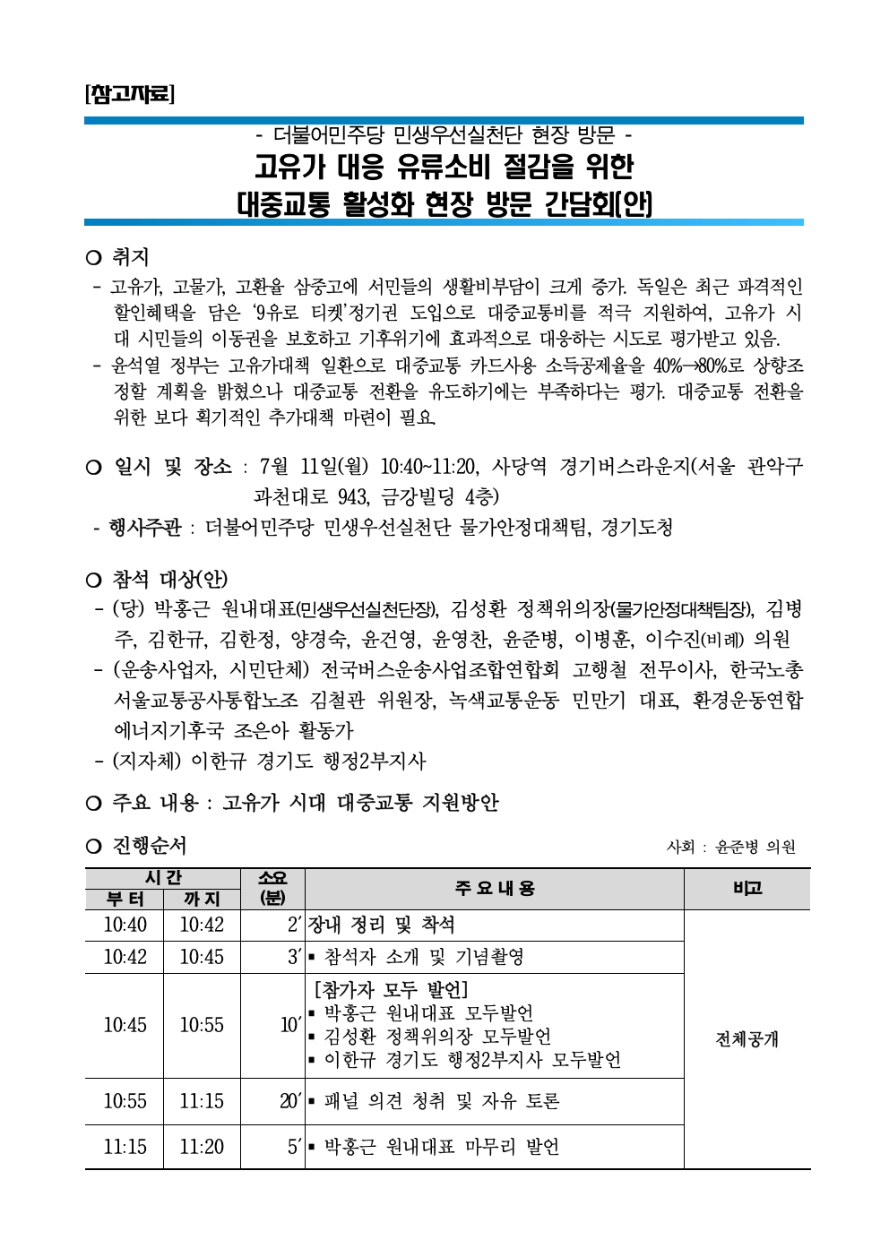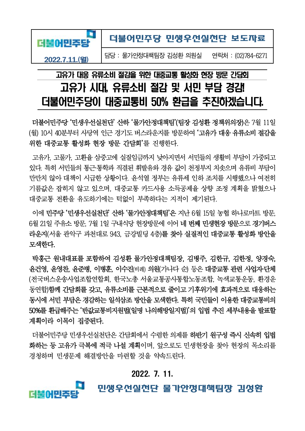 [보도자료] 더불어민주당 민생우선실천단, 고유가 대응 유류소비 절감을 위한 대중교통 활성화 현장 방문 간담회