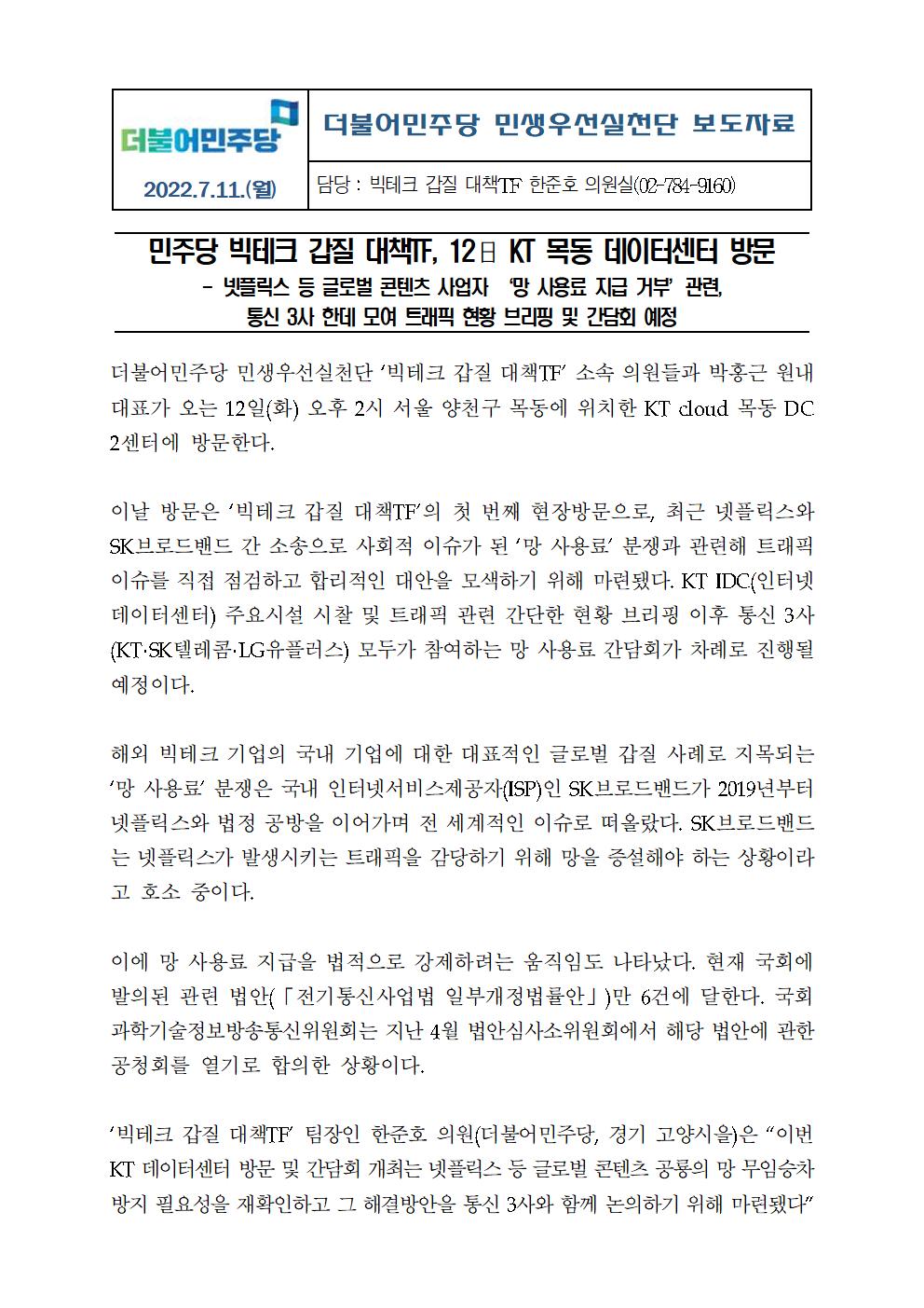 [보도자료] 더불어민주당 민생우선실천단, 빅테크 갑질 대책TF, 12일 KT 목동 데이터센터 방문