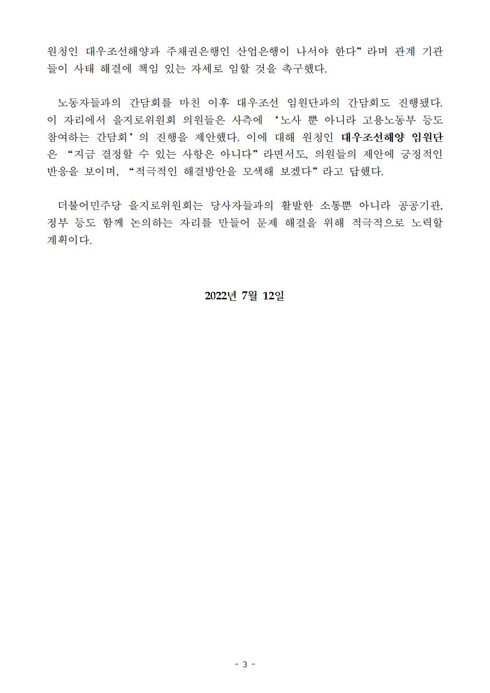 [보도자료] 더불어민주당 을지로위원회, 거제 대우조선해양 하청노동자 투쟁 현장 방문 및 간담회 진행