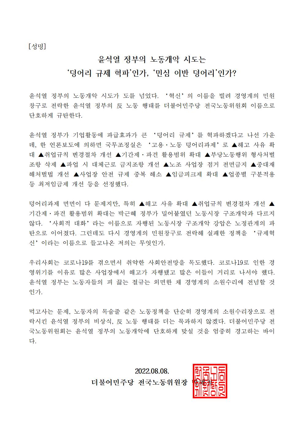 220808_성명_윤석열_정부의_노동개악_시도는_덩어리_규제_혁파인가_민심_이반_덩어리인가(최종).hwp