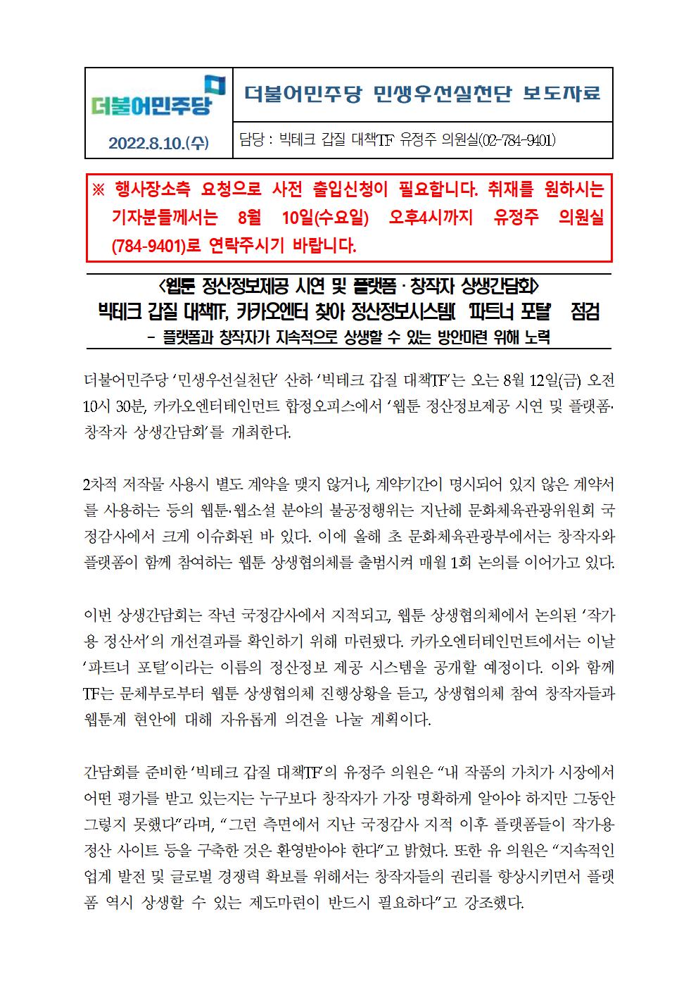 [보도자료] 더불어민주당 빅테크 갑질대책TF, 웹툰 정산정보제공 시연 및 플랫폼-창작자 상생간담회 개최