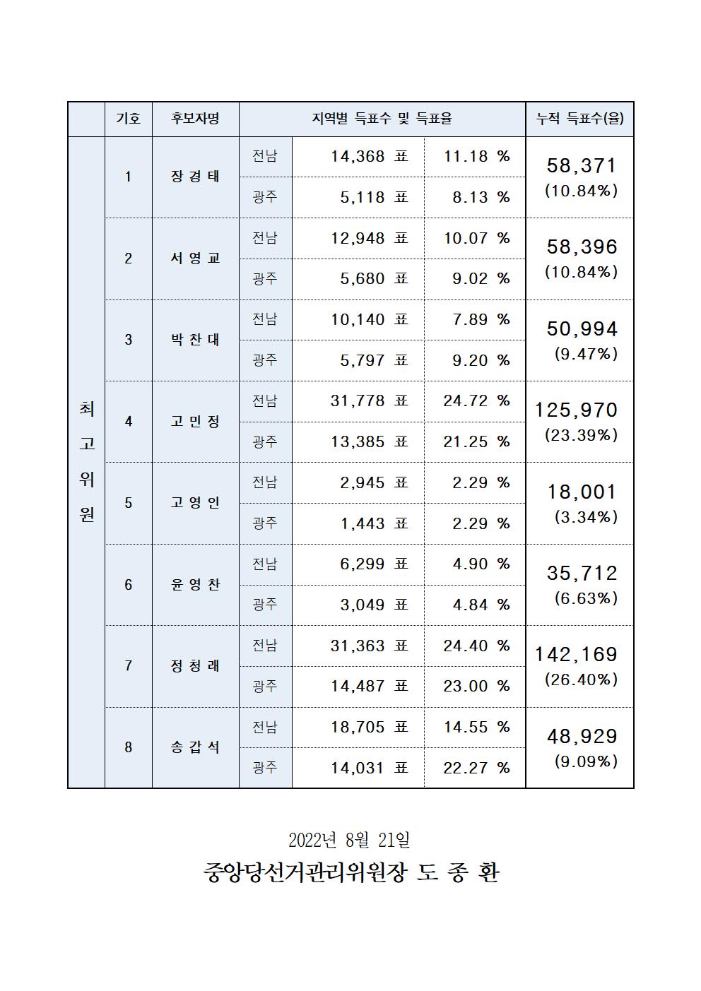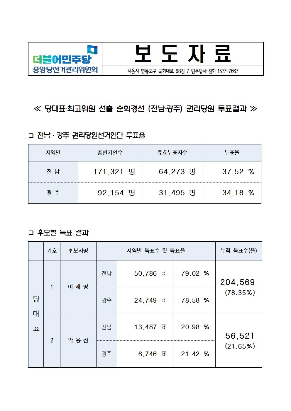 [보도자료] 당대표‧최고위원 선출 순회경선(전남·광주) 권리당원 투표결과