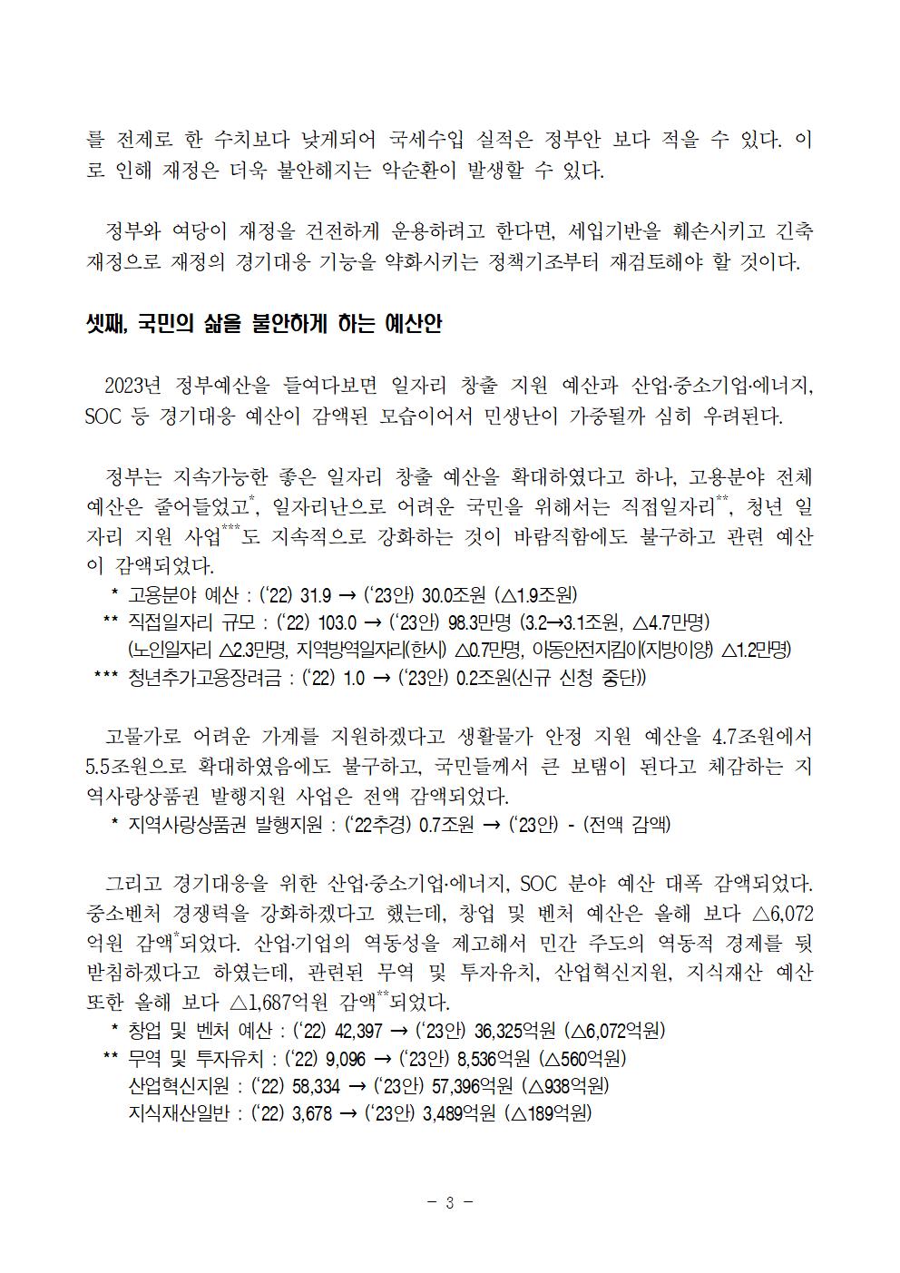 [보도자료] 더불어민주당 정책위원회, 2023년 정부예산안에 대한 더불어민주당 입장