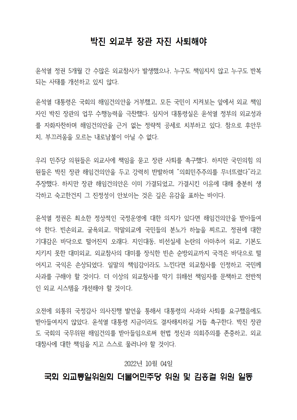 [성명서] 국회 외교통일위원회 더불어민주당 위원 및 김홍걸 위원 일동, 박진 외교부 장관 자진 사퇴해야