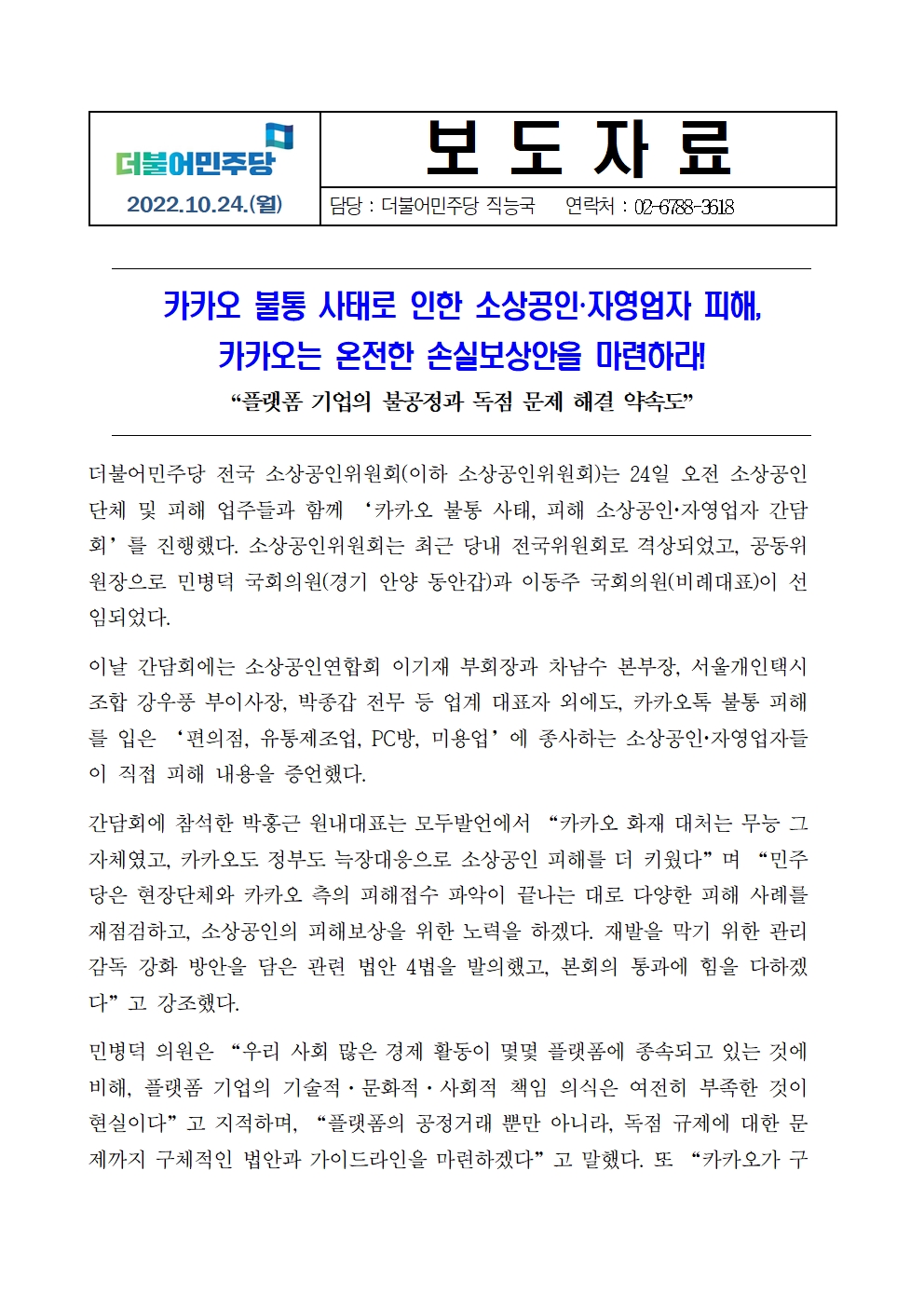 [보도자료] 더불어민주당 소상공인위원회, 카카오 불통 사태로 인한 소상공인·자영업자 피해, 카카오는 온전한 손실보상안을 마련하라!