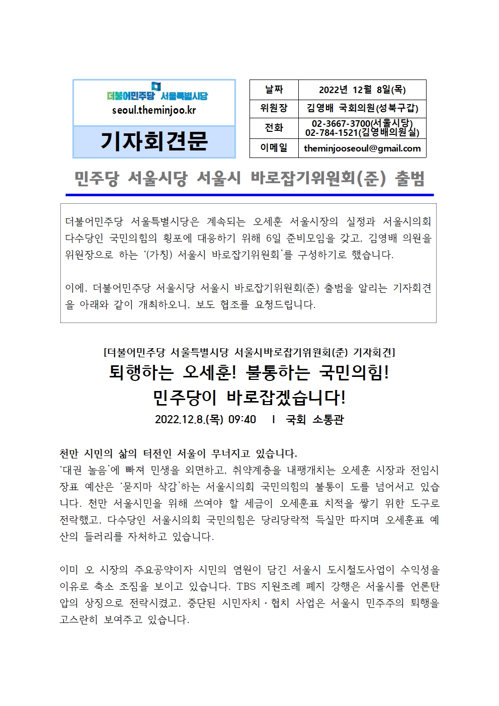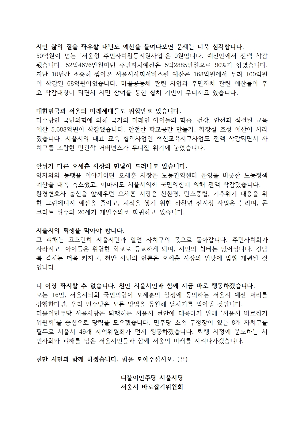 [기자회견문] 서울시당 서울시 바로잡기위원회, 퇴행하는 오세훈! 불통하는 국민의힘! 민주당이 바로잡겠습니다!