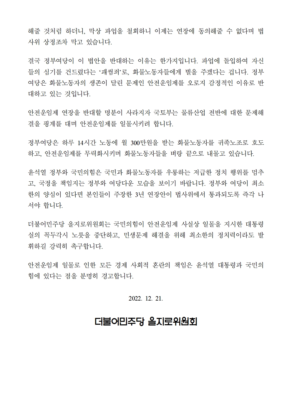 [기자회견문] 더불어민주당 을지로위원회, 정부여당은 안전운임제 3년 연장법을 법사위에 즉각 상정하길 강력히 촉구합니다