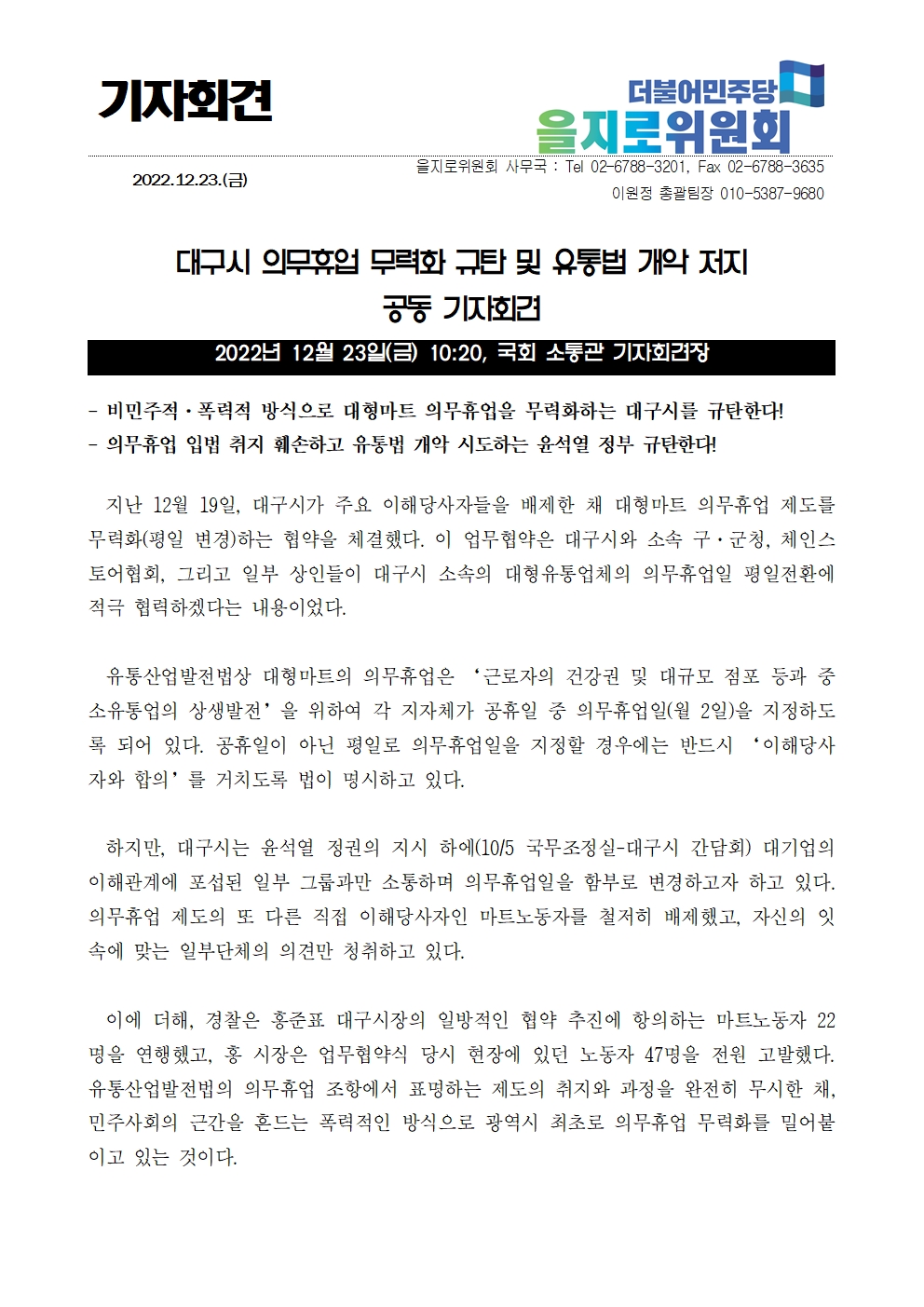 [기자회견문] 더불어민주당 을지로위원회, 대구시 의무휴업 무력화 규탄 및 유통법 개악 저지 공동 기자회견