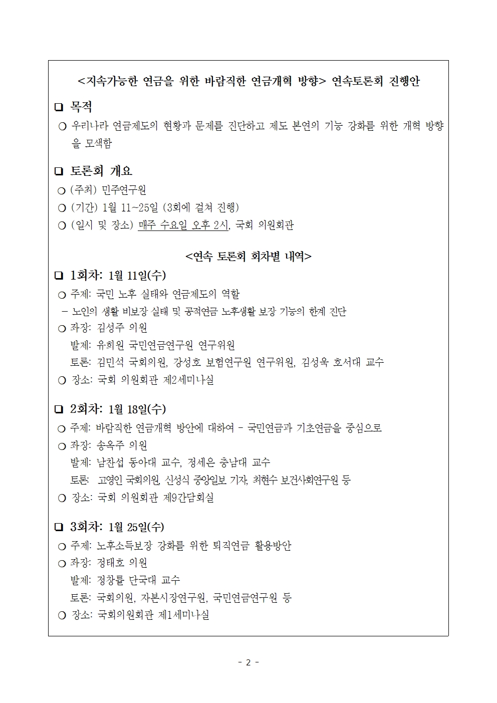 [보도자료] 더불어민주당 민주연구원, 지속가능한 연금을 위한 바람직한 연금개혁 방향 연속토론회 개최