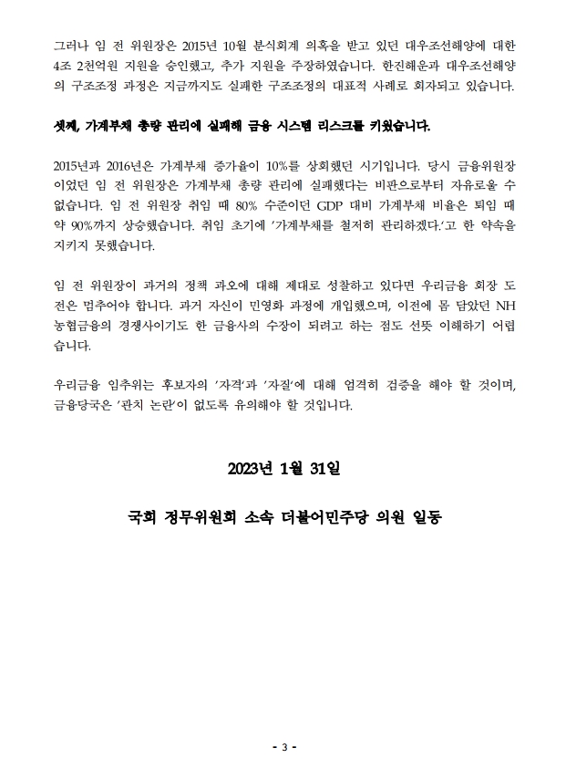 [보도자료] 정무위 소속 민주당 의원들 "금융 실정 장본인의 우리금융 회장 도전은 부적절"
