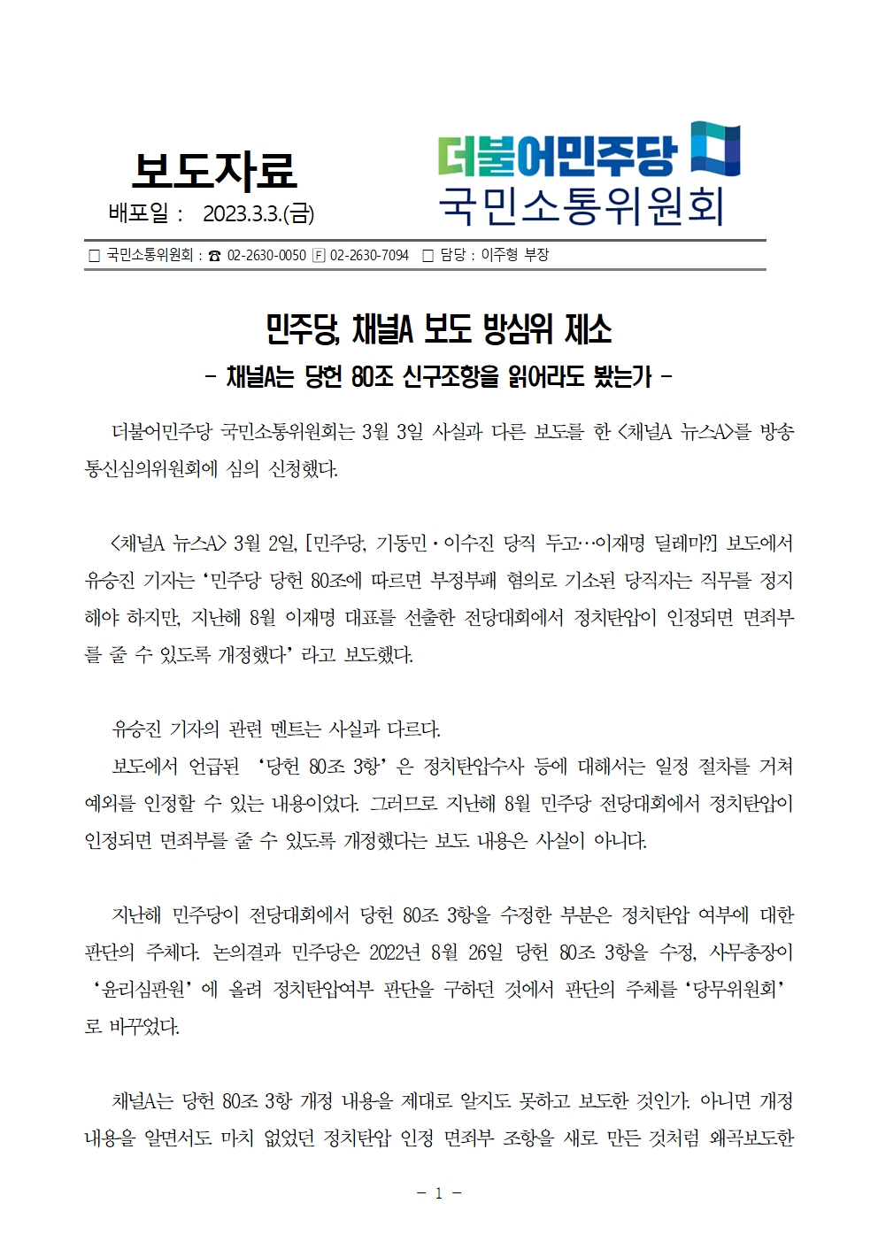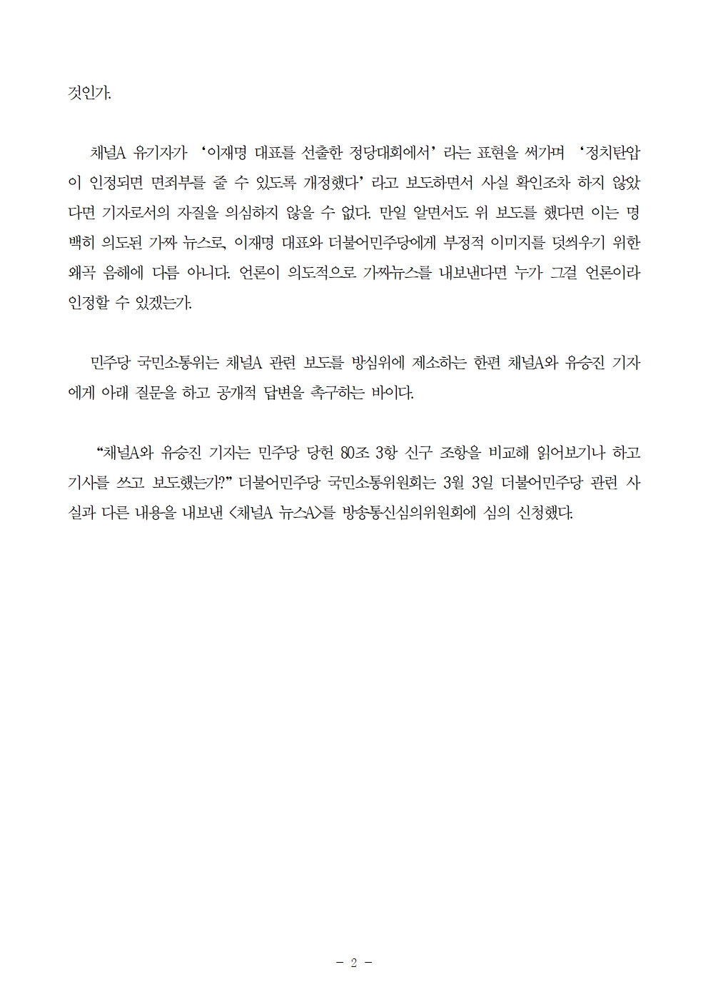 [보도자료] 더불어민주당 국민소통위원회, 채널A 보도 방심위 제소 - 채널A는 당헌 80조 신구조항을 읽어라도 봤는가 -