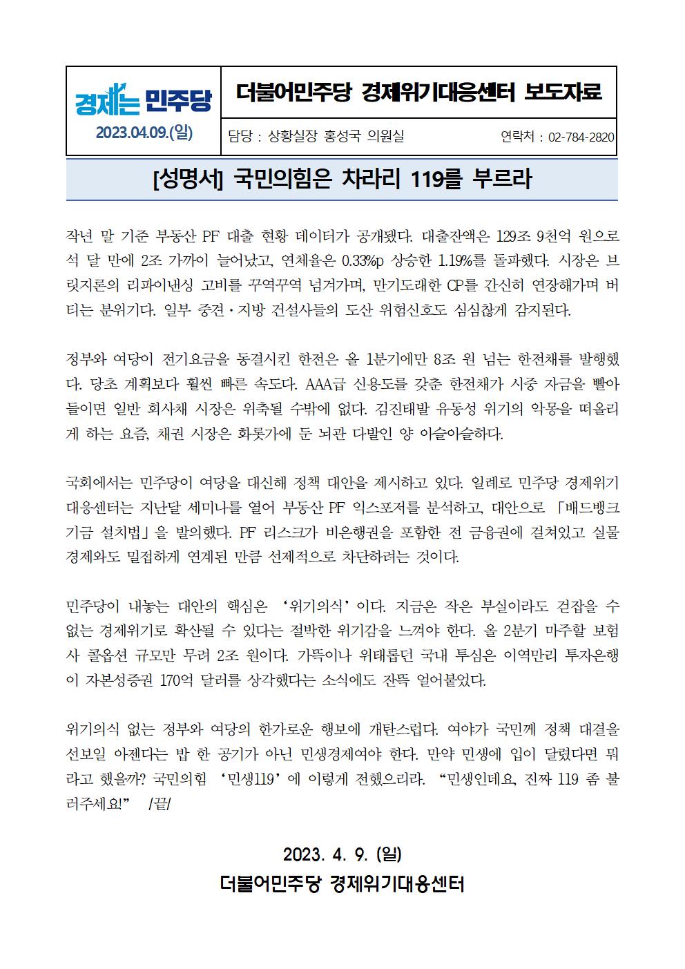 [성명서] 더불어민주당 경제위기대응센터, 국민의힘은 차라리 119를 부르라