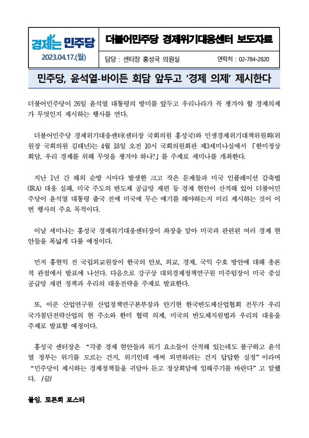 [보도자료] 더불어민주당 경제위기대응센터, 민주당, 윤석열-바이든 회담 앞두고 '경제 의제' 제시한다